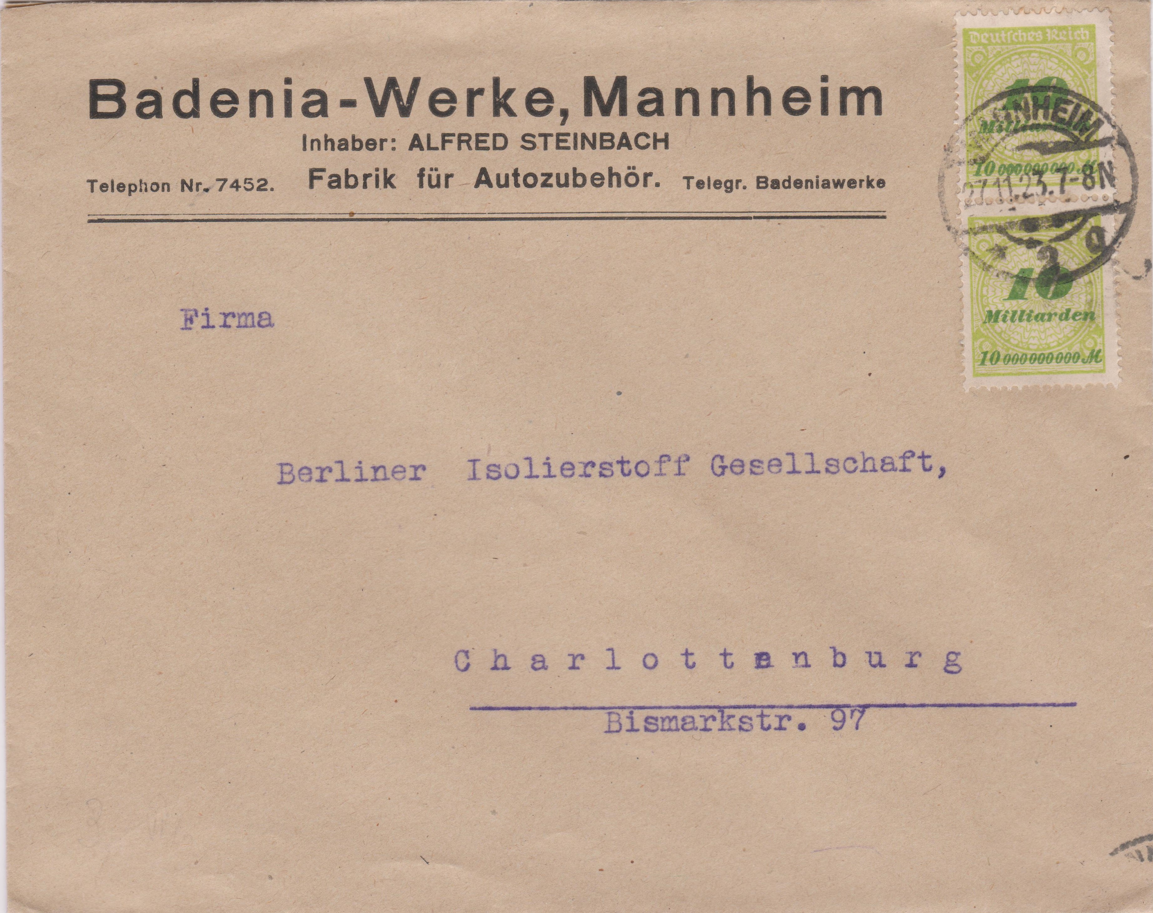 Mehrfachfrankatur eines Zweierstreifens der Deutsches Reich MiNr. 328 AP, aufgegeben am 27.11.1923 um "7-8N" (= 17 bis 18 Uhr), adressiert nach "Charlottenburg", also im Fernverkehr gelaufen: