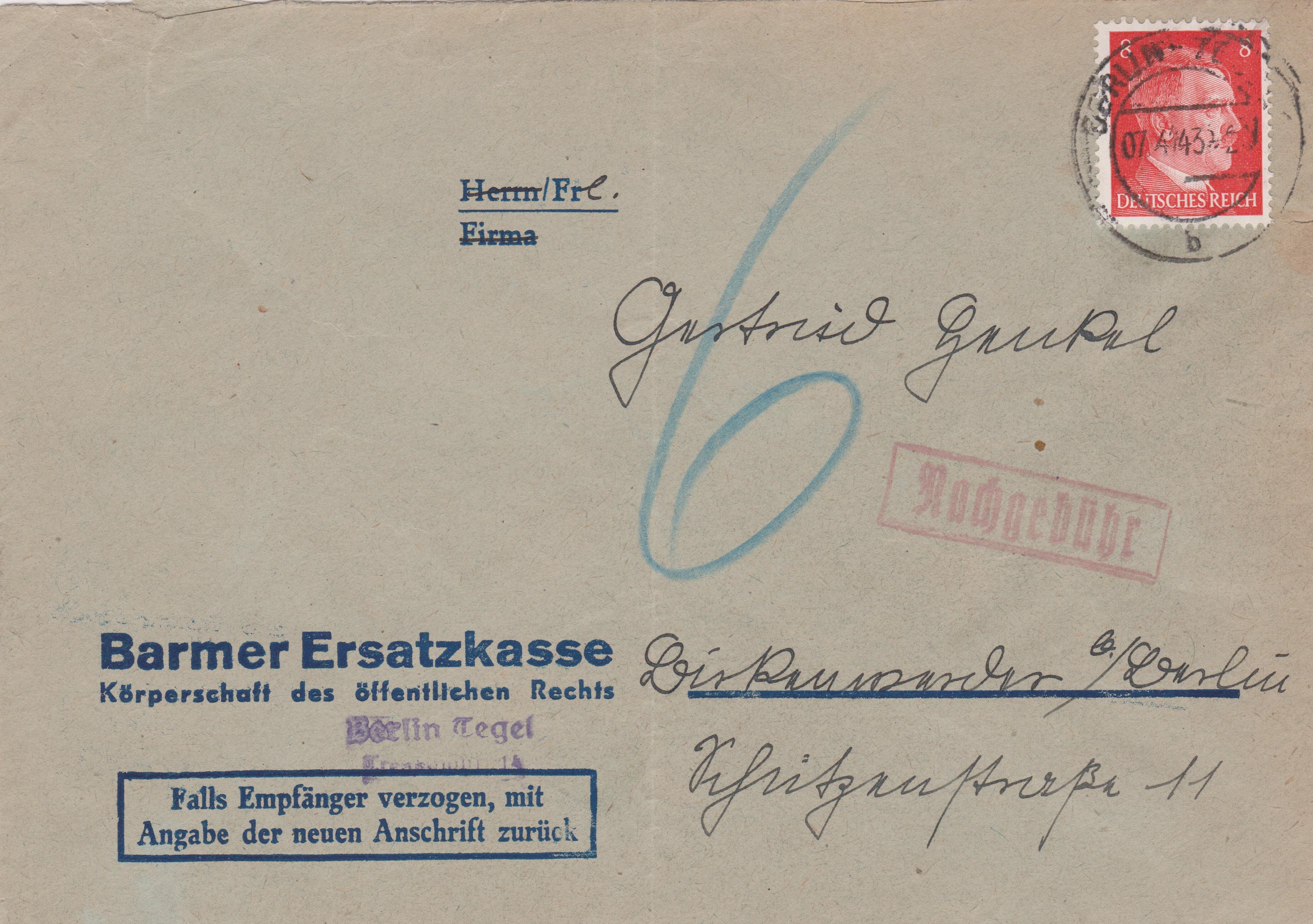 Brief von BERLIN-TEGEL nach Birkenwerder bei Berlin, am 07.04.1943 freigemacht zum Ortstarif von 8 Pf: