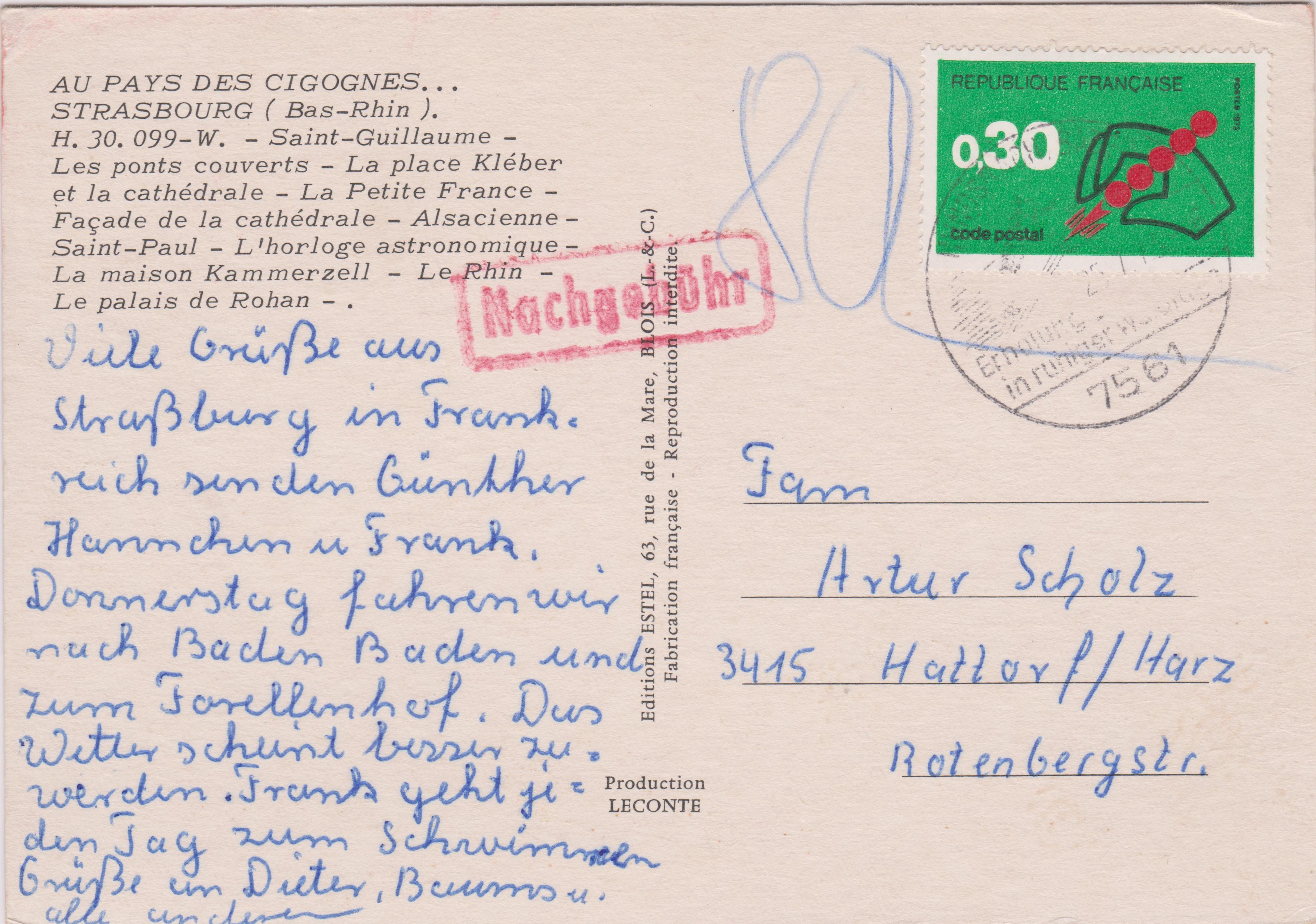 Als Frankatur wurde ein französisches Postwertzeichen der Wertstufe 0,30 verklebt. Aufgegeben wurde diese Postkarte jedoch nicht in Frankreich, sondern in Deutschland, wo ein Tagesstempel mit der Postleitzahl "7561" das in Deutschland nicht gültige französische Postwertzeichen entwertetete. Dann wurde dieser Fehler bemerkt und das in Deutschland nicht gültige Postwertzeichen wurde mit Blaustift umrahmt und so als ungültig dokumentiert. Links daneben wurde mit Blaustift eine "80" als beim Empfänger einzuziehende "Nachgebühr" ausgewiesen, worauf ein Rahmenstempel hinweist.