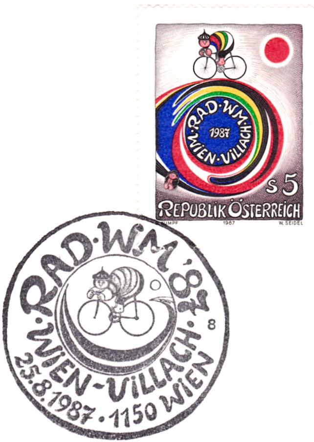 FDC mit der Marke zu den Straßen-Weltmeisterschaften 1987 in Villach aus Österreich (MiNr 1897) mit einem Plakat zur WM nach einem Entwurf von Gottfried Kumpf und dem Sonderstempel zum Ersttag aus Wien.