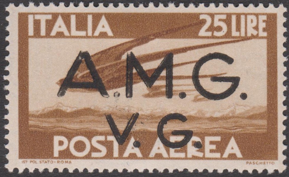 Julisch-Venetien MiNr. 30 erschien am 23.07.1947 in einer Auflage von 121.100 Stück: Italien MiNr. 712 mit Aufdruck "A.M.G. V.G." (= Allied Military Government Venezia Guilia):