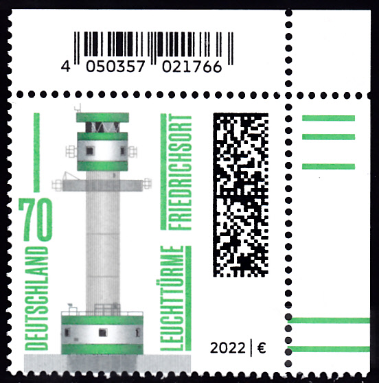 In der Endlos-Serie "Leuchttürme" ist 2022 diese Marke (MiNr 3696) mit einer Darstellung "Leuchtturm Friedrichsort". Diese Marke ist für mich die bisher hässlichste Marke der ganzen Serie.