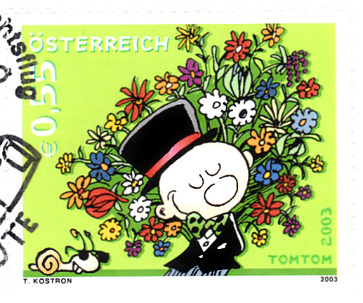 Auf dieser Marken aus Österreich (MiNr 2444) wird die Comicfigur TomTom mit einem Blumenstrauß gezeigt.