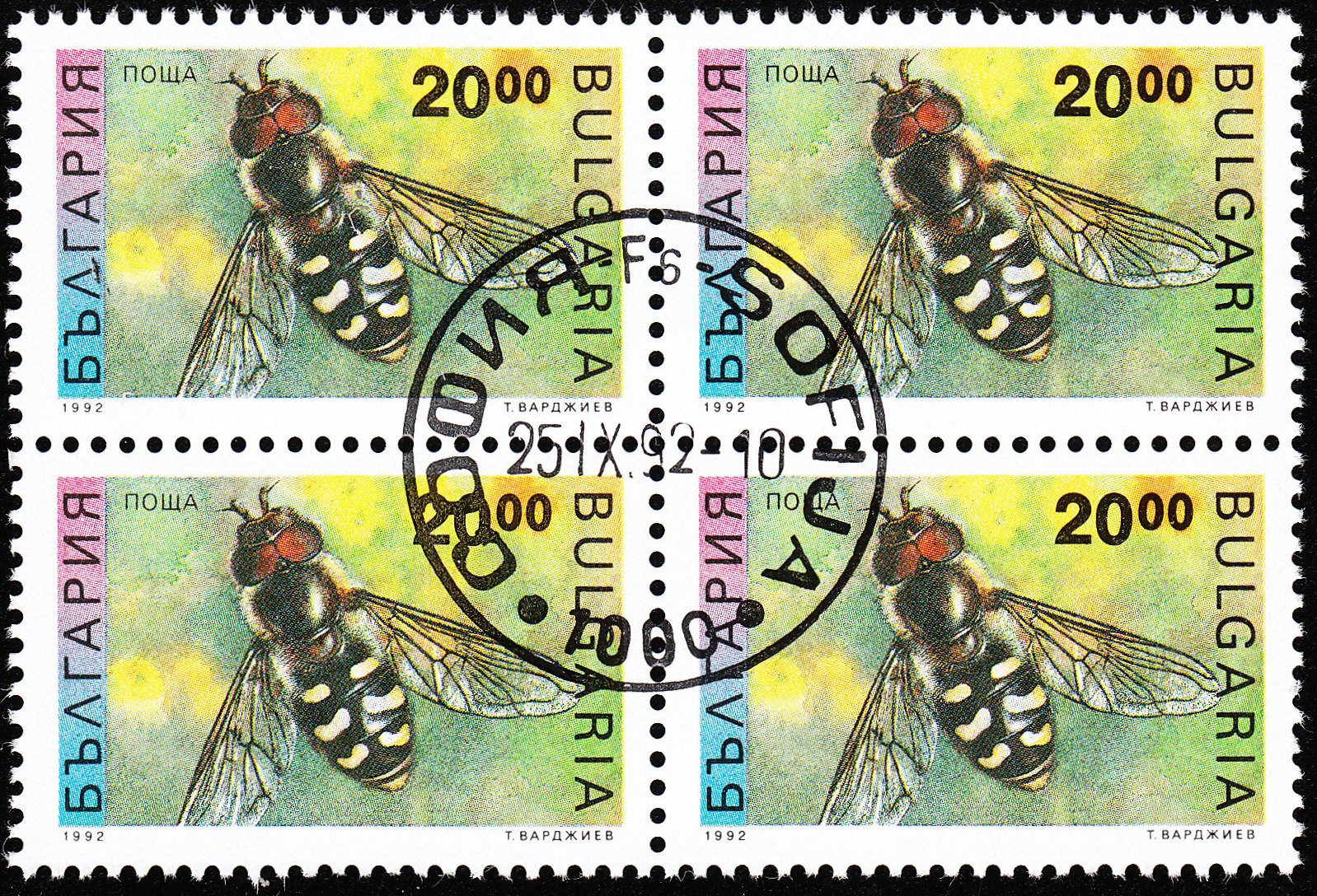 Diese Freimarke Bulgarien MiNr. 3999 zeigt eine solche Schwebfliege, hier im Viererblock entwertet am 25.09.1992 als Erstausgabetag: