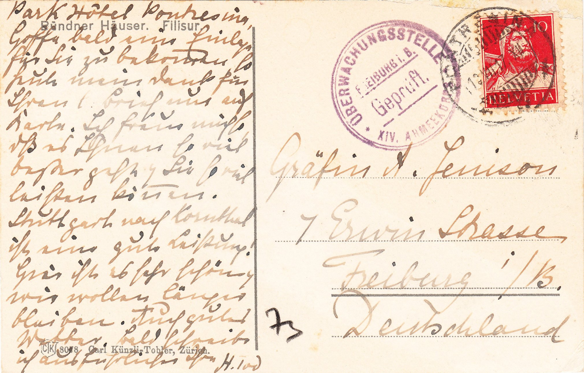 Der Brief wurde laut Prüfstempel (K4) in Violett: "Geprüft Überwachungsstelle Freiburg, Bd. XIV. Armeekorps"