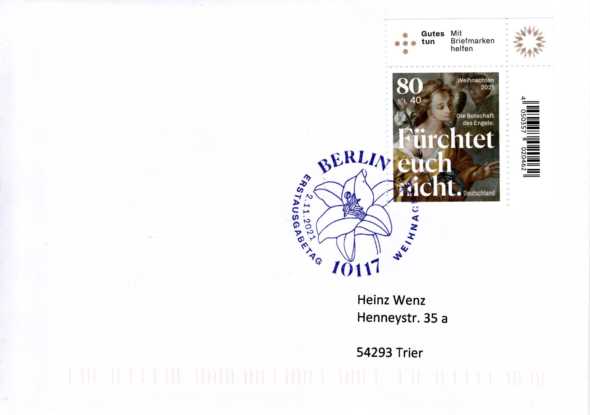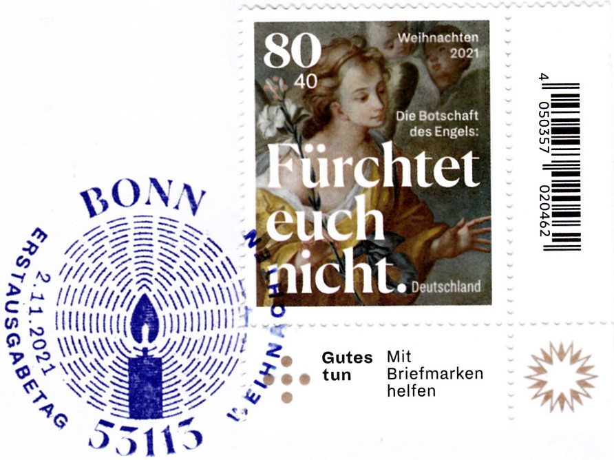 Auf der Zuschlagsmarke "Weihnachten" 2021 der Deutschen Post (MiNr 3636) ist das Ölgemälde "Verkündigungsengel mit Lilie, im Hintergrund zwei Puttenköpfchen in den Wolken" von Johann Michael abgebildet.