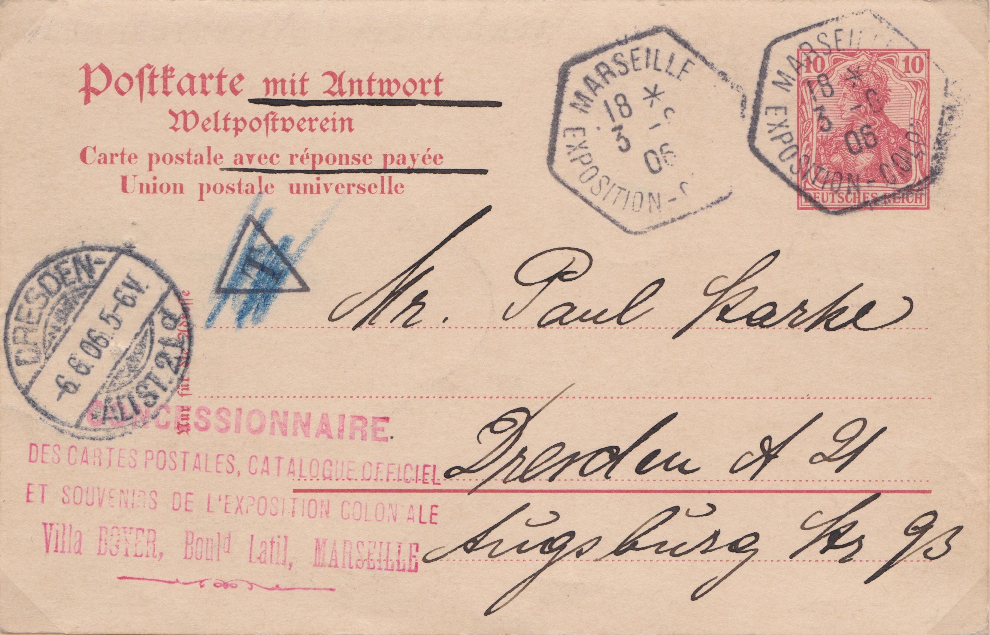 Dieser wurde dann jedoch mit Blaustift wieder gestrichen und die deutsche Frankatur wurde in Marseille auf der Kolonialausstellung entwertet und somit als frankaturgültig anerkannt!