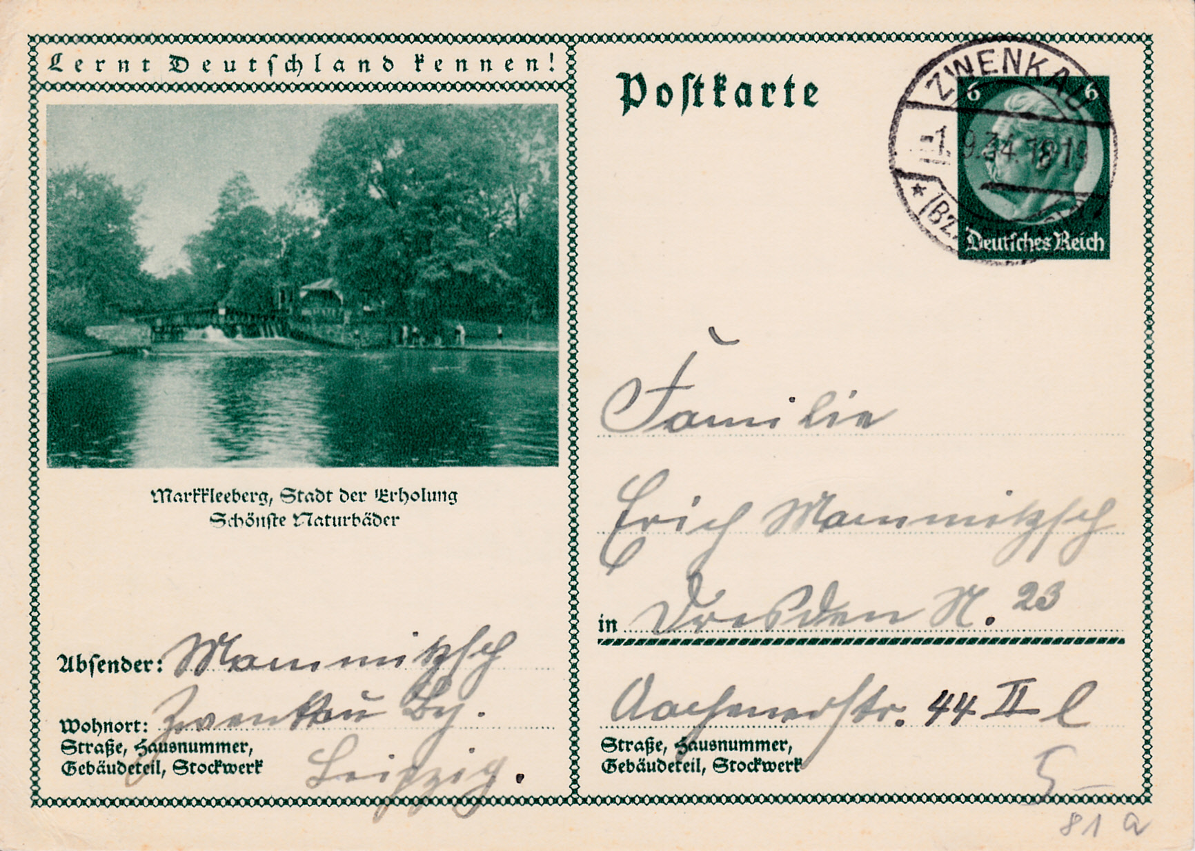 Die Stadt Markkleeberg wirbt auf dieser Karte (MiNr P 232/81) als "Stadt der Erholung" mit dem Bild eines Naturbades.