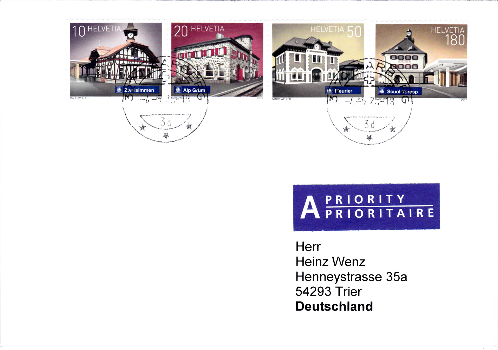 Auf diesem Brief von Aarberg nach Trier wurden vier der hier gezeigten Marken mit Schweizer Bahnhöfen als Porto auf einem Priority Brief bis 50 Gramm verwendet. Das Porto beträgt 2,60 Franken.