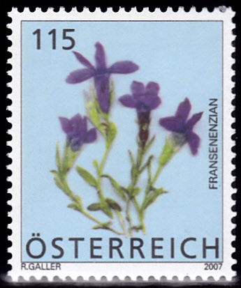 Auf dieser Marke aus Österreich (MiNr 2681) sehen wir etwas mehr als nur die Blüte von einem Fransenenzian (Gentianopsis ciliata).