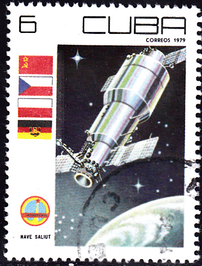 Aus Kuba kommt diese Marke (MiNr 2128). Sie zeigt die Raumstation Salut und die Raumkapsel Sojus 11 beim Kopplungsmanöver im Jahre 1971.