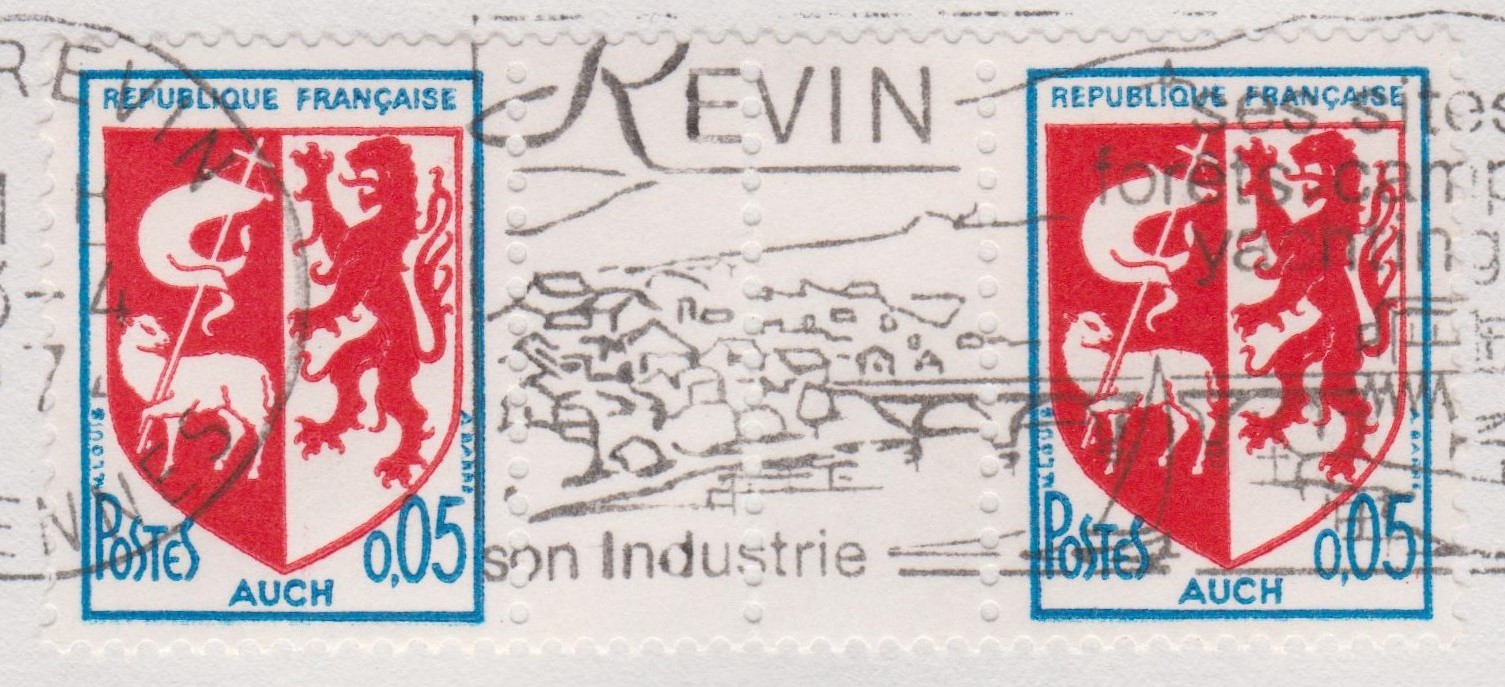 Die französische Stadt AUCH zeigt ein Lamm Gottes in ihrem Stadtwappen, das auf dem Postwertzeichen Frankreich MiNr. 1534 dargestellt wurde, hier ein Zwischenstegpaar auf Brief: