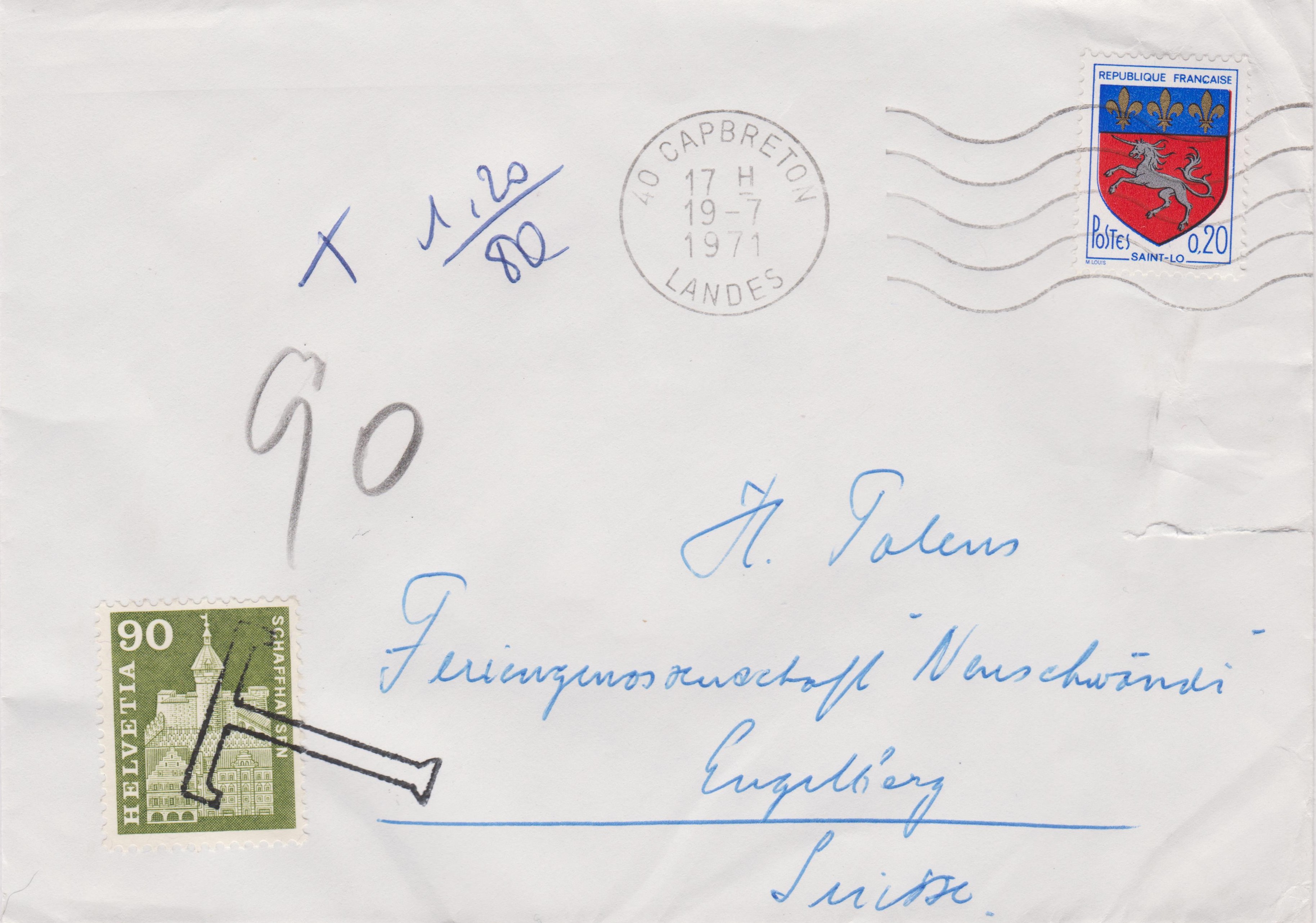 Dieser in die Schweiz (= Suisse) adressierte Brief wurde am 24.07.1970 frankiert mit 0,20 Francs in "40 CAPBRETON LANDES" in Frankreich aufgegeben, was ein Maschinenstempel mit Welleneinsatz dokumentiert:
