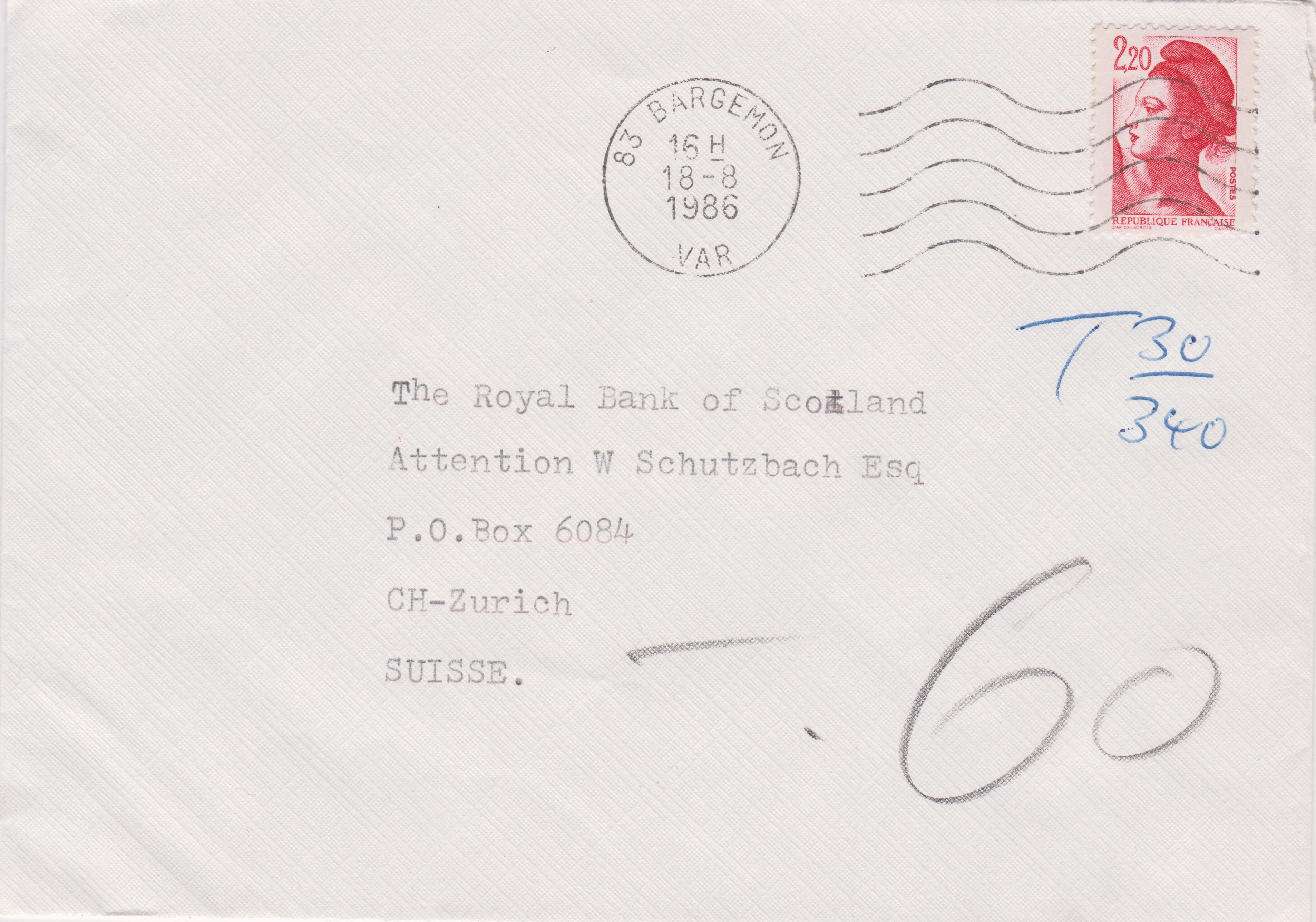 Dieser nach Zürich adressierte Brief wurde in 83 BARGEMON in Frankreich am 18.08.1986 lediglich mit 2,20 Francs freigemacht: