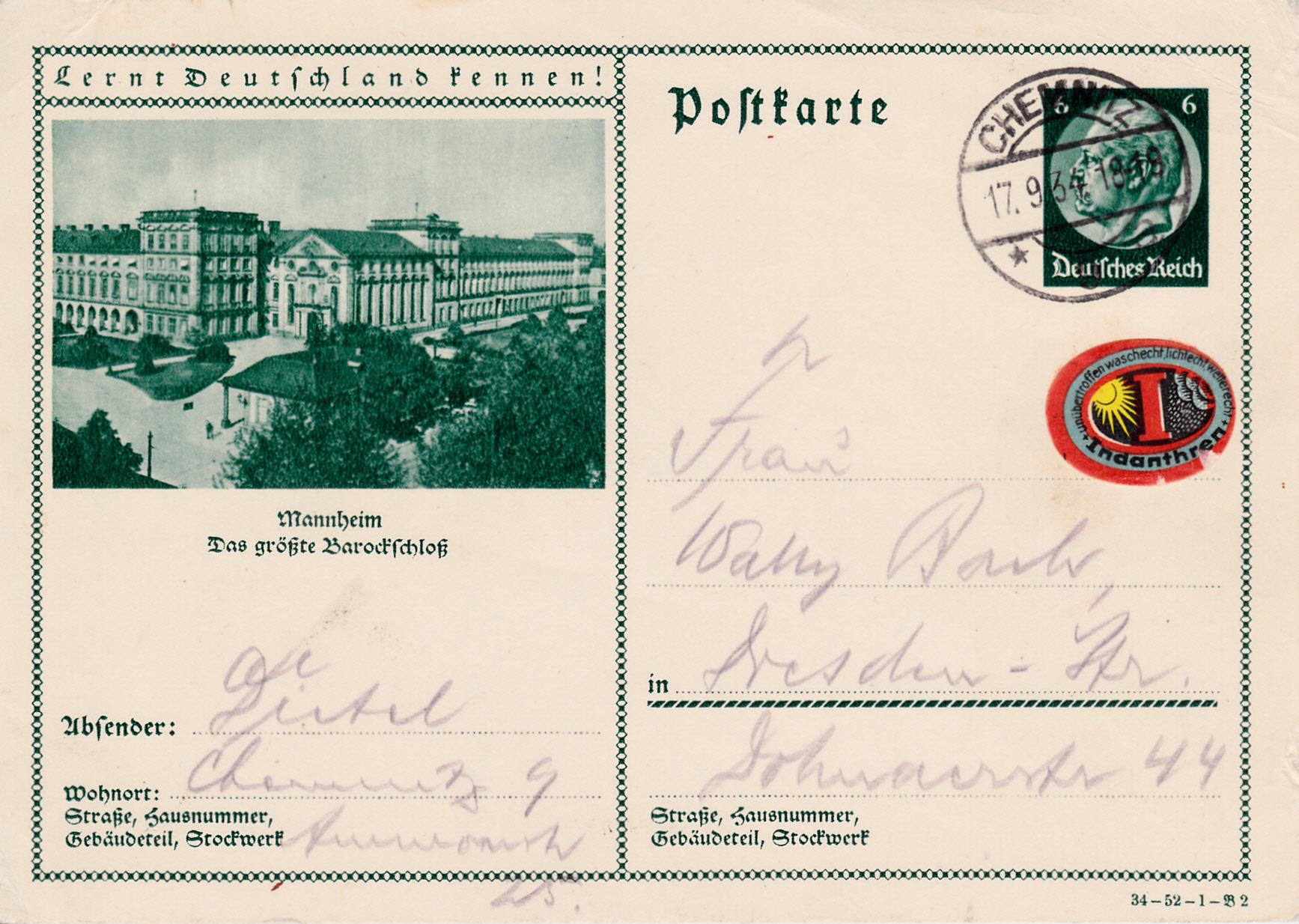 Mannheim zeigt auf einer Karte (Serie 52 Bild 2) eine weitere Ansicht mit dem Mannheimer Schloss und der Schlosskirche (Eckgebäude in der Bildmitte).