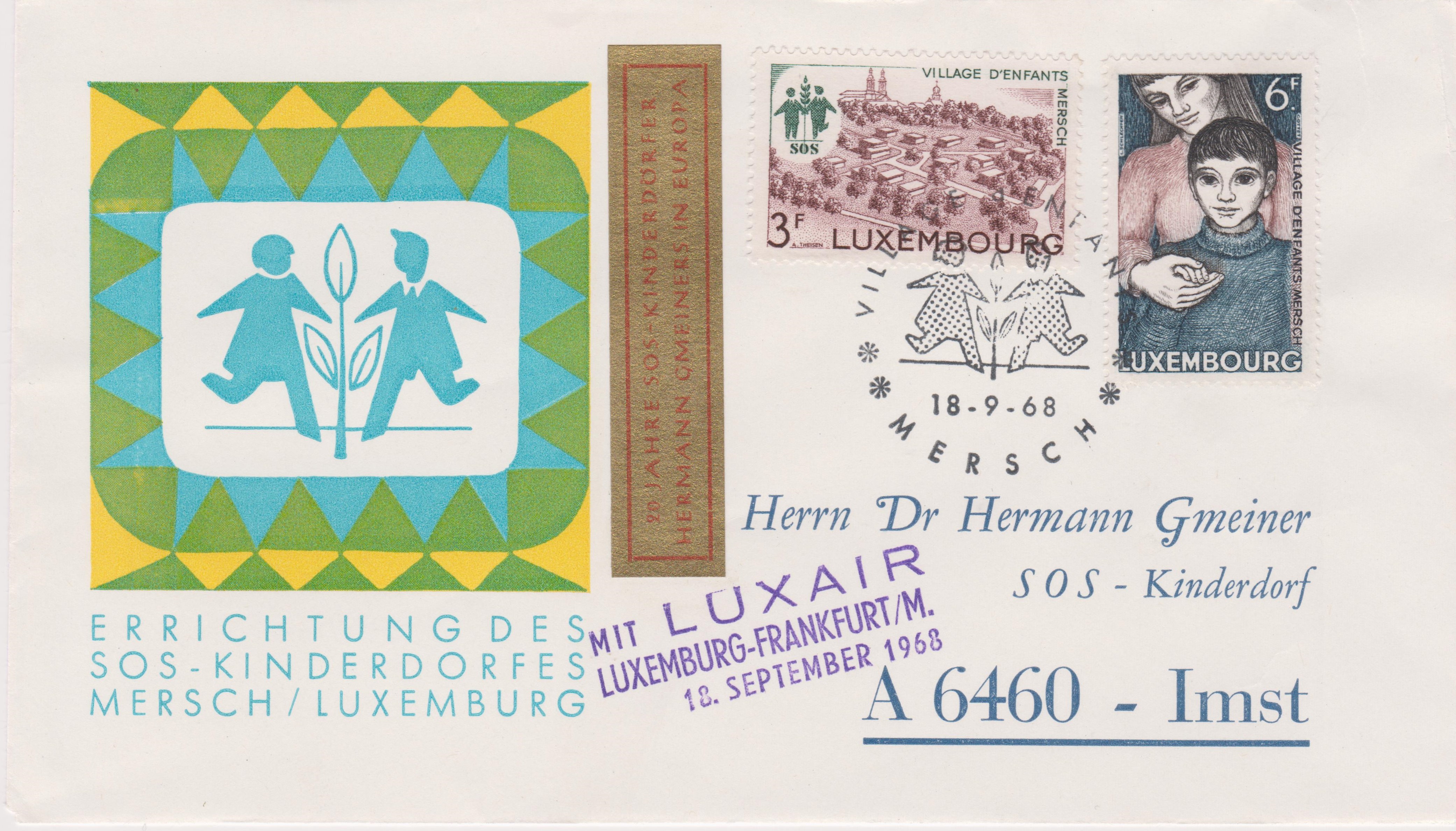 Dieser Beleg wurde zur Errichtung des SOS-Kinderdorfes am 18.09.1968 in MERSCH in Luxemburg aufgegeben und die Frankatur wurde mit dem entsprechenden Sonderstempel entwertet. Dann ging es am selben Tag "MIT LUXAIR LUXEMBURG-FRANKFURT" und von dort weiter nach Imst in Österreich: