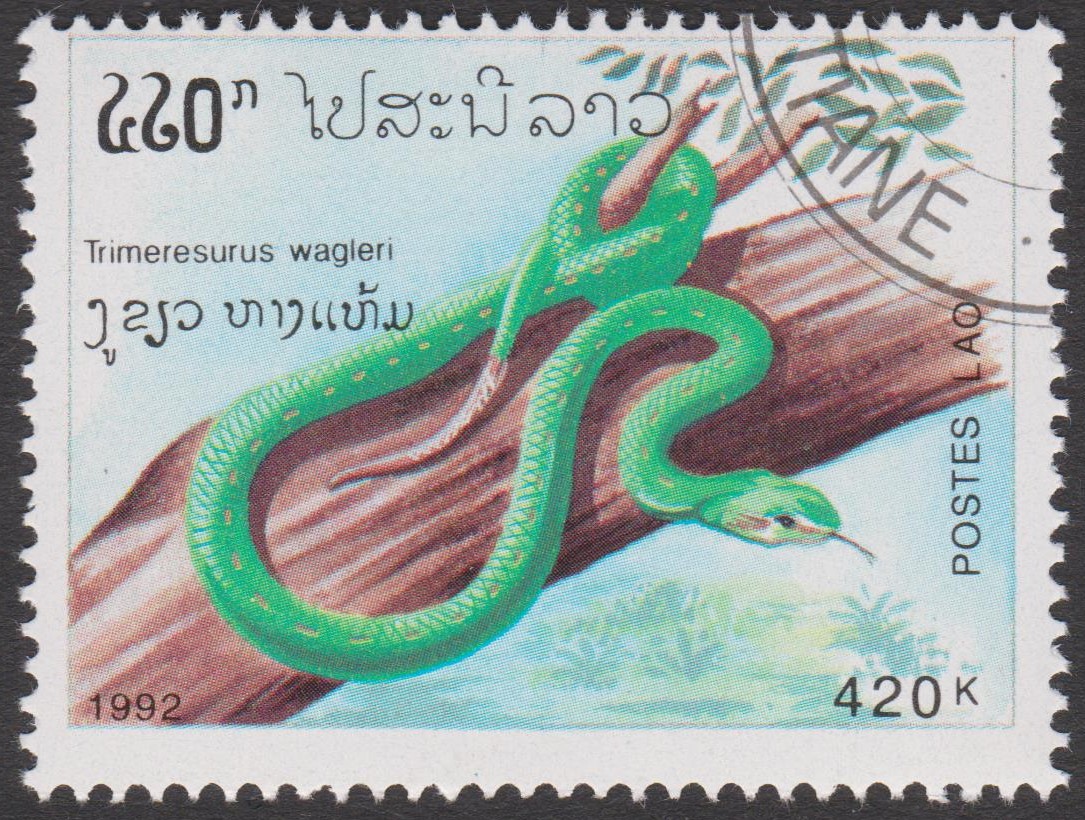 Dieses Postwertzeichen aus Laos, MICHEL 1314, zeigt eine Trimeresurus wagleri: