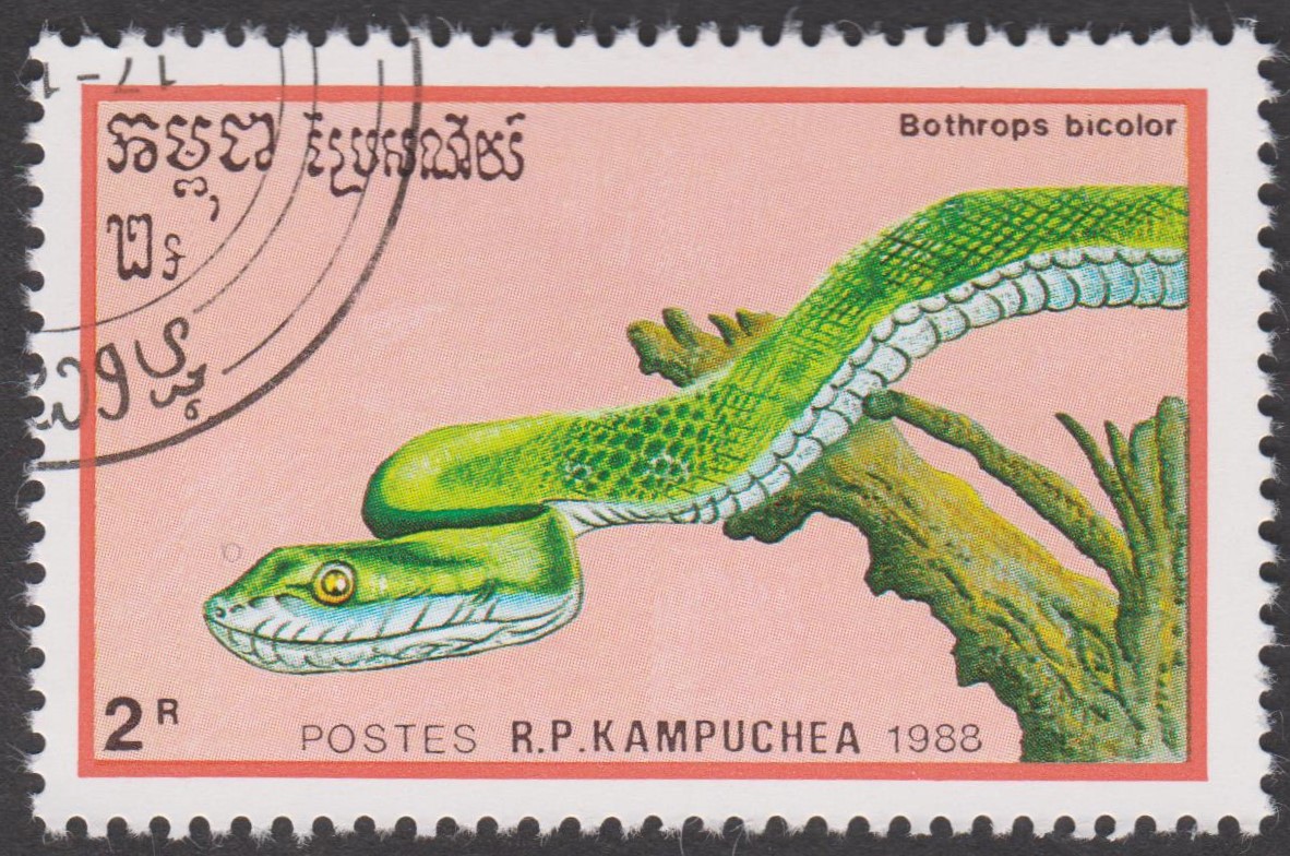 Dieses Postwertzeichen aus Kampuchea = Kambodscha, MiNr. 988, zeigt eine Zweifarbige Palmlanzenotter: