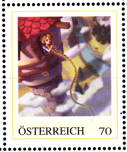 Diese Marke aus Österreich gehört zwar zu den "Marken auf Privatbestellung" wurde aber von der Post selbst in einem Buch mit dem Titel "Ausgewählte Märchen der Gebrüder Grimm" verkauft. Die Marke zeigt Rapunzel mit herunter gelassenem Haar.