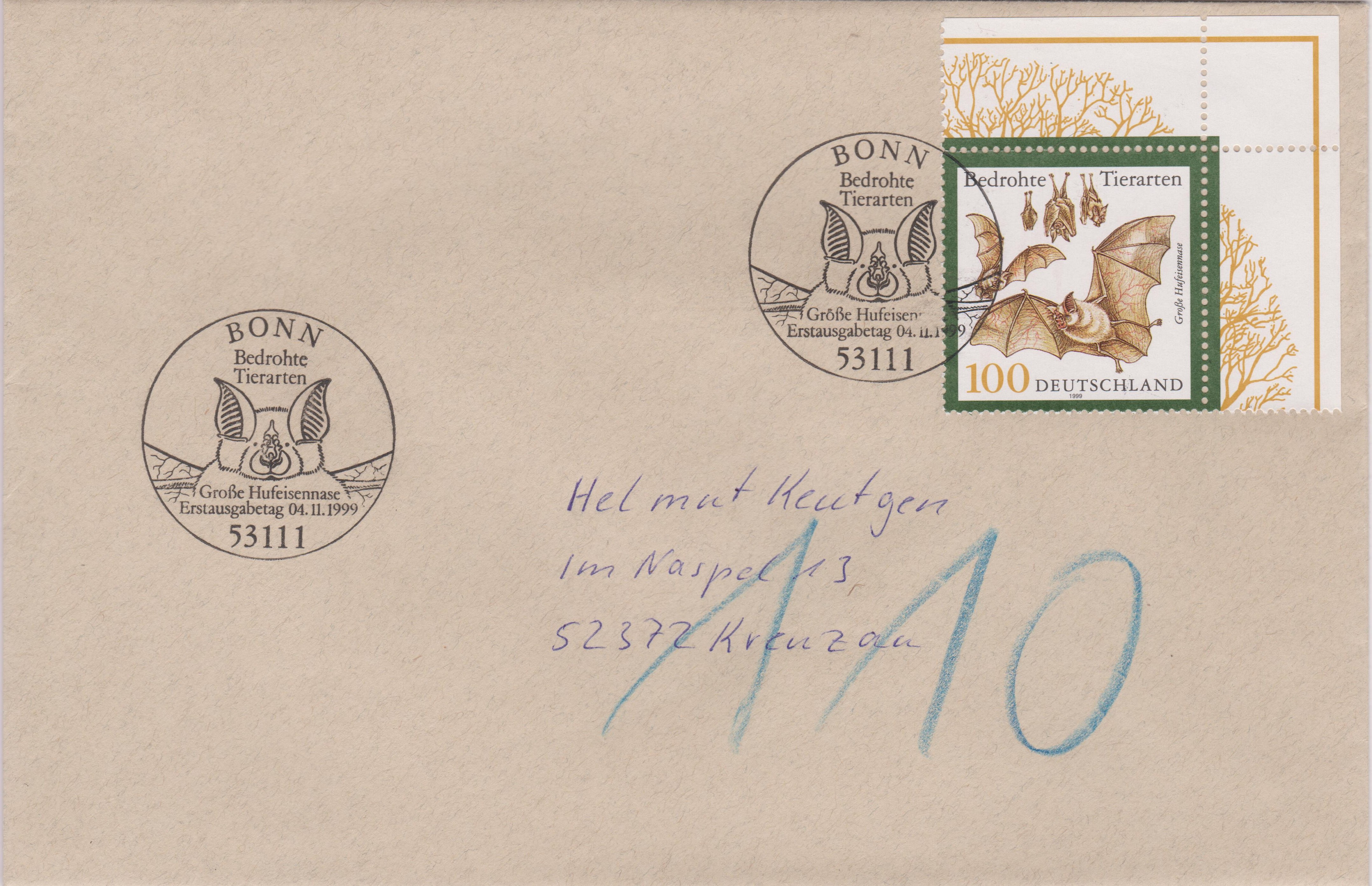 Deutschland MiNr. 2086 mit der Abbildung von mehreren Großen Hufeisennasen (Rhinolophus ferrumequinum) auf echt gelaufenem Ersttagsbrief, entwertet mit Ersttagsstempel 53111 BONN: