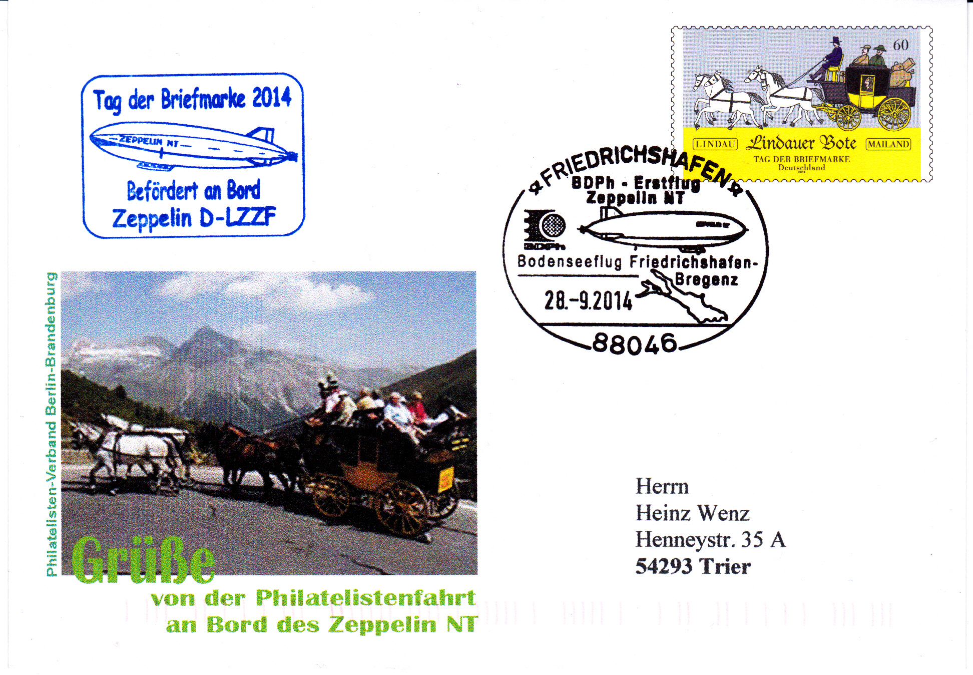 Ganzsachenumschlag mit dem Wertzeicheneindruck der MiNr 3101 zum Tag der Briefmarke 2014 (Motiv: Lindauer Bote) und einem Zudruck des Philatelisten-Verbandes Berlin-Brandenburg. Der Beleg wurde im Rahmen der Feiern zum "Lindauer Boten" am 28.9.2014 an Bord des Zeppelin NT befördert.