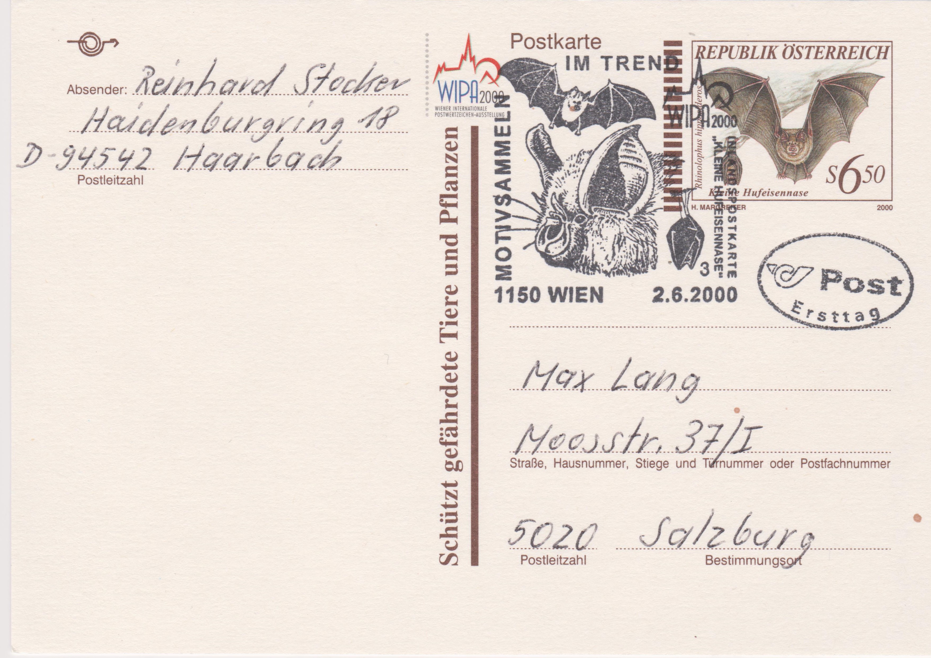 Diese Inlandspostkarte aus Österreich mit dem Wertstempel zu 6,50 Schilling (MiNr P 549) mit einer Kleinen Hufeisennase wurde am 2.6.2000 (Ausgabetag) mit einem Sonderstempel zur WIPA 2000 mit passendem Stempelmotiv gestempelt. Sie ist leider nicht gelaufen. Auf dem Zudruck der Karte ist eine Zwergfledermaus abgebildet.