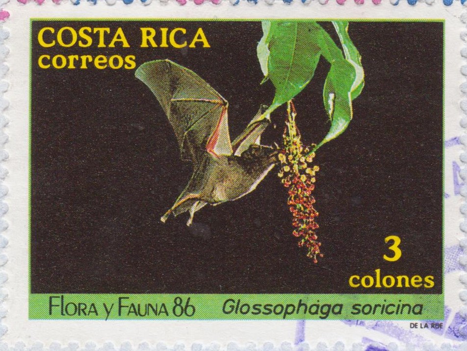 Die Gemeine Blütenfledermaus oder Spitzmaus-Langzüngler (Glossophaga soricina) ist von Mexiko bis Argentinien verbreitet. Auf dieser Marke aus Costa Rica (MiNr 1315) wird eine Gemeine Blütenfledermaus oder Spitzmaus-Langzüngler (Glossophaga soricina) gezeigt.