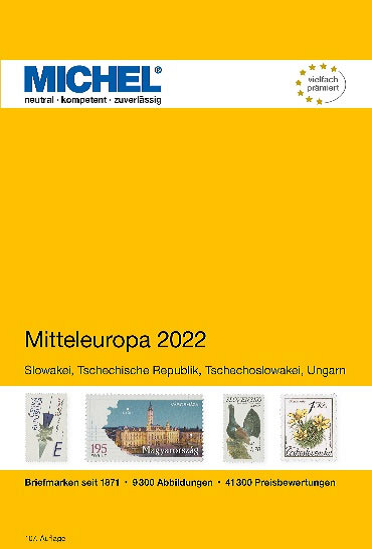 Ebenfalls am 4. März 2022 erscheint der Michel Katalog Katalog Mitteleuropa 2021 (E 2) in der 107. Auflage in Farbe mit 832 Seiten im Format: 155 x 230 mm als Hardcover. Er kostet in Papierversion als Katalog 54,00 €. Er enthält die Länder Slowakei, Tschechische Republik, Tschechoslowakei, Ungarn, Westungarn.