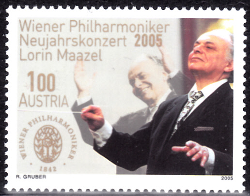 In Österreich erschien 2005 zum Neujahrskonzert der Wiener Philharmoniker unter der Leitung von Lorin Maazel diese Marke (MiNr 2506), die Lorin Maazel (1930–2014, amerikanischer Dirigent) beim Dirigieren zeigt.