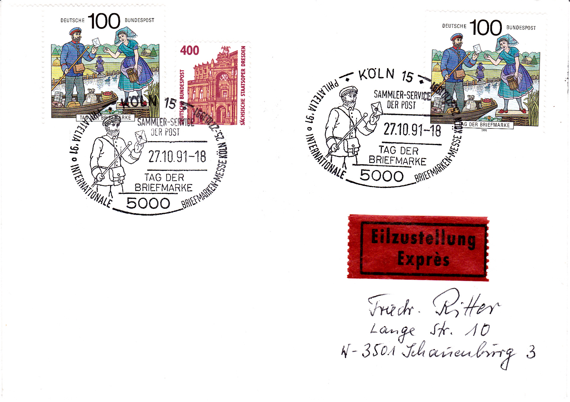 Auf der Philatelia '91, einer Briefmarkenmesse in Köln, gab es zum Tag der Briefmarke 1991 am 27.10.1991 diesen Sonderstempel des Sammler-Service der Post. Der Brief wurde per Eilzustellung verschickt und wurde gemäß rückseitigem Stempel am 1.11.1991 zugestellt.