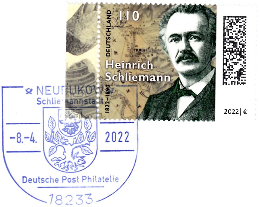 Zum 200. Geburtstag von Heinrich Schliemann erschien bei der Deutschen Post eine Marke (MiNr 3659) mit einem Porträt von Heinrich Schliemann vor einer historischer Landkarte. Hier zeige ich ein Eckrandstück mit EAN-Codierung.