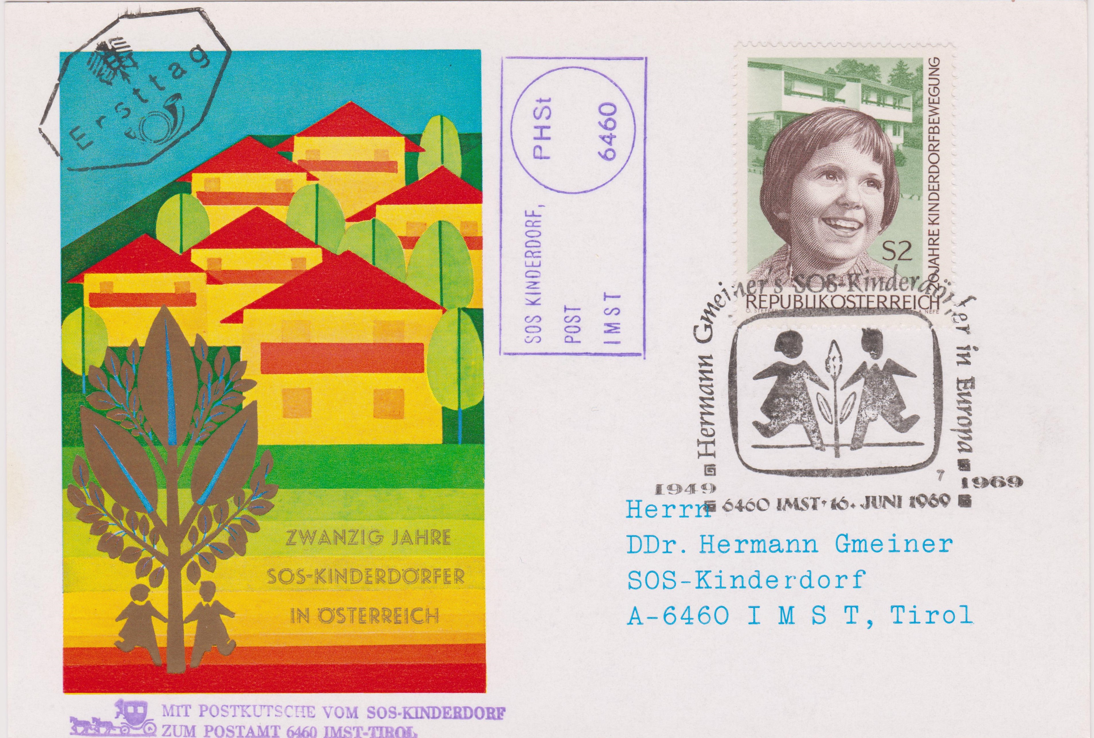 Dieser Beleg wurde am 16.06.1969 als "Ersttag" der Sondermarke "20 JAHRE KINDERDORFBEWEGUNG" in der PHSt (= PostHilfsStelle) 6460 IMST aufgegeben und "MIT POSTKUTSCHE VOM SOS-KINDERDORF ZUM POSTAMT 6460 IMST-TIROL" befördert, wo die Frankatur mit Sonderstempel entwertet wurde: