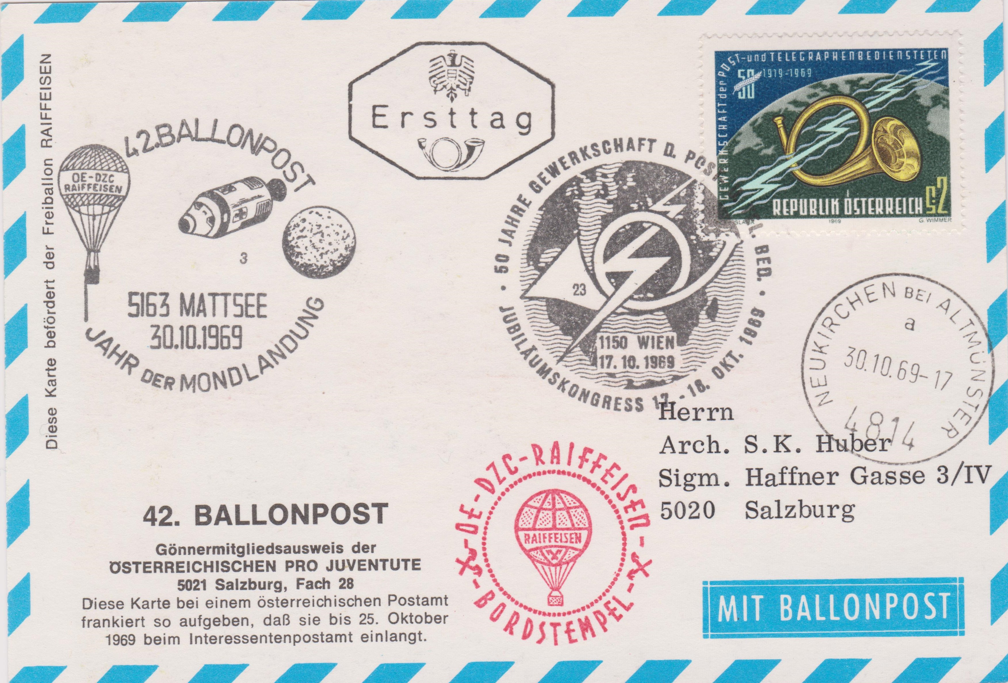 Es handelt sich um einen "Gönnermitgliedsausweis der ÖSTERREICHISCHEN PRO JUVENTUTE", der dann am 30.10.1969 als "42. BALLONPOST" mit dem Ballon "OE-DZC RAIFFEISEN" befördert wurde, was ein Aufgabestempel "5163 MATTSEE" (Kennziffer "1") sowie ein Ankunftstempel "NEUKIRCHEN BEI ALTMÜNSTER a" dokumentieren.