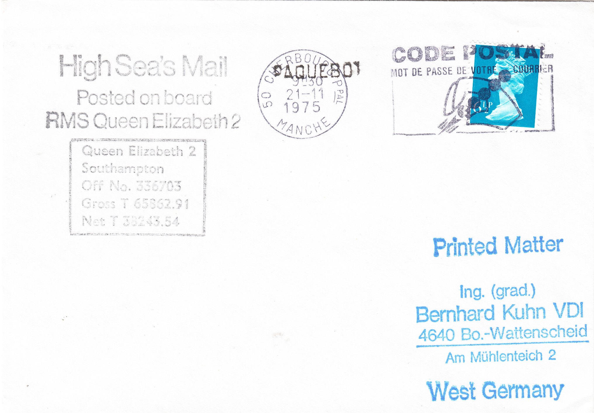 Dieser an Bord der RMS QUEEN ELIZABETH 2 aufgegebene Beleg mit britischer Frankatur wurde am 21.11.1975 in Cherbourgh der französischen Post zur Weiterbeförderung übergeben: