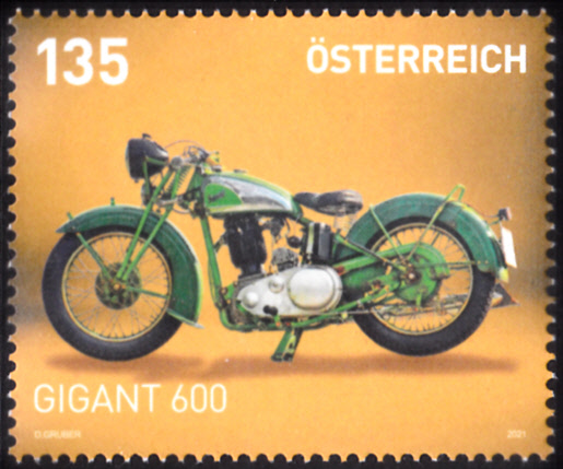 Diese Marke aus Österreich (MiNr 3584) aus der Serie "Motorräder" zeigt ein Gigant 600 OHV aus dem Jahr 1938, eine besondere Rarität aus einem wenig bekannten Wiener Unternehmen. Motorräder der Marke Gigant wurden nur von 1936 bis 1938 gebaut.