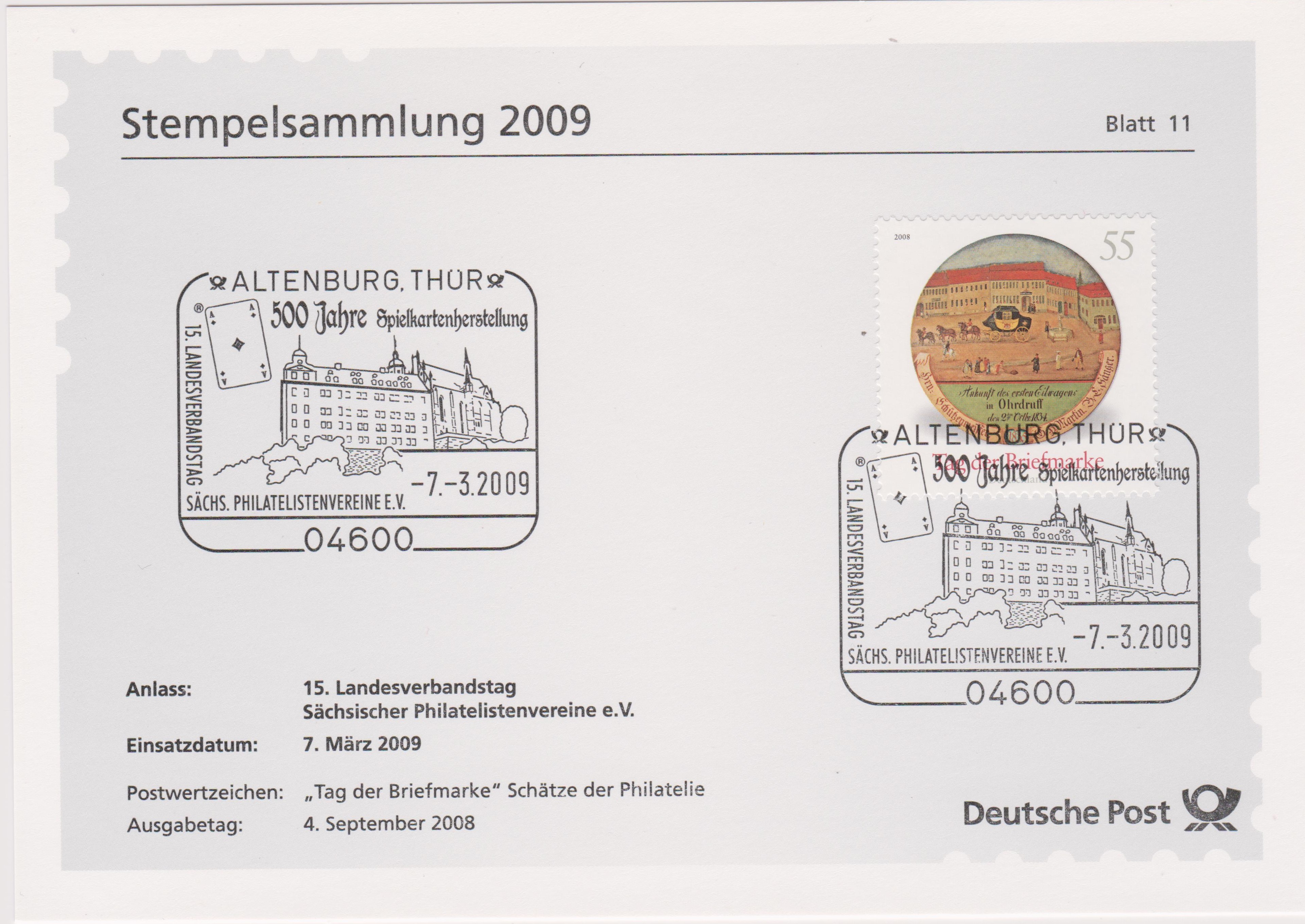 Dieser Sonderstempel aus "04600 ALTENBURG" in Thüringen erschien aus Anlaß "500 Jahre Spielkartenherstellung" und zeigt eine Spielkarte, ein Karo-As: