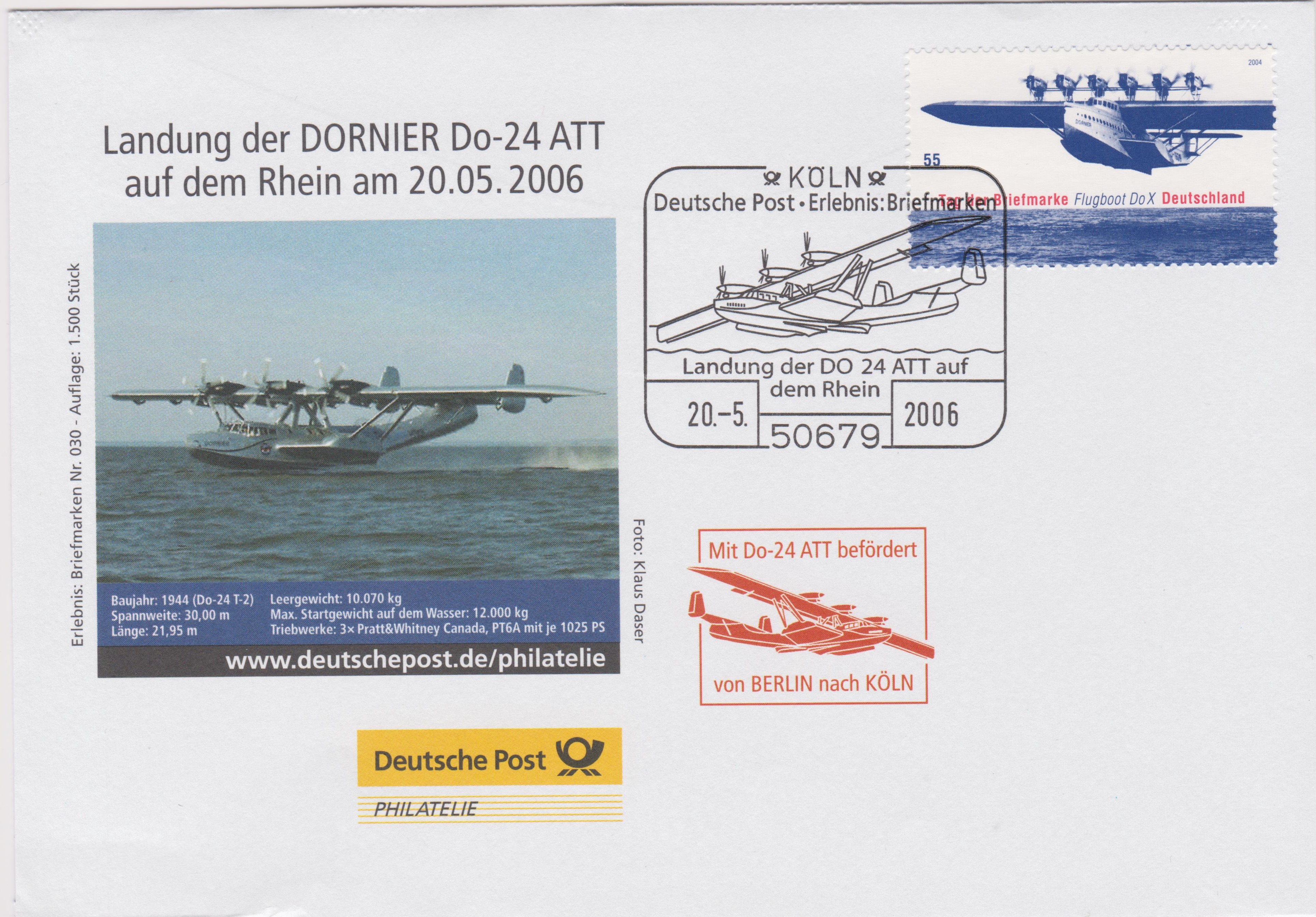 Demnach beförderte eine DORNIER Do-24 ATT diese 1500 Belege von BERLIN nach KÖLN und landete auf dem Rhein.