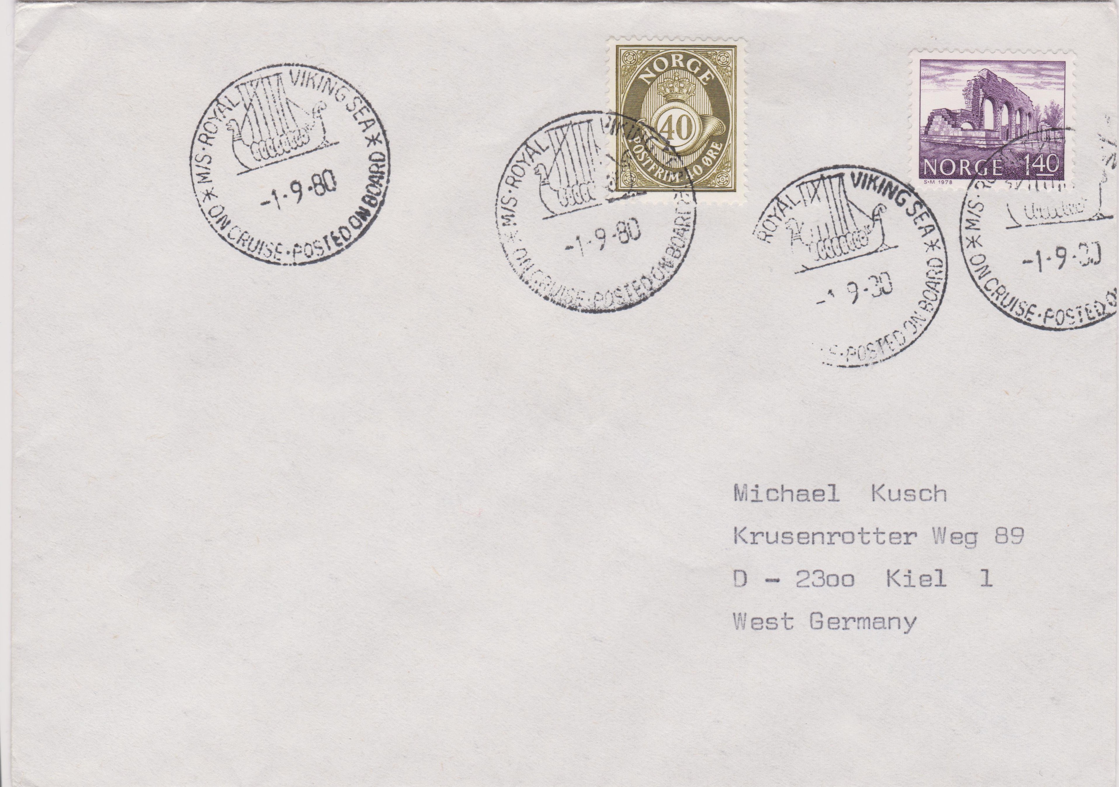 Dieser Beleg wurde am 01.09.1980 an Bord der M/S ROYAL VIKING SEA aufgegeben und die norwegische Frankatur wurde mit dem Schiffspoststempel entwertet: