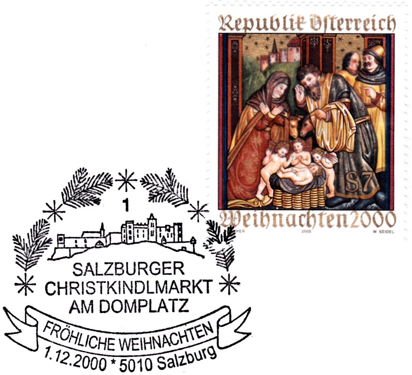 Dieser Sonderstempel aus Salzburg vom 1.12.2000, dem Ersttag dieser Weihnachtsmarke, passt auch zu dieser Weihnachtsmarke.