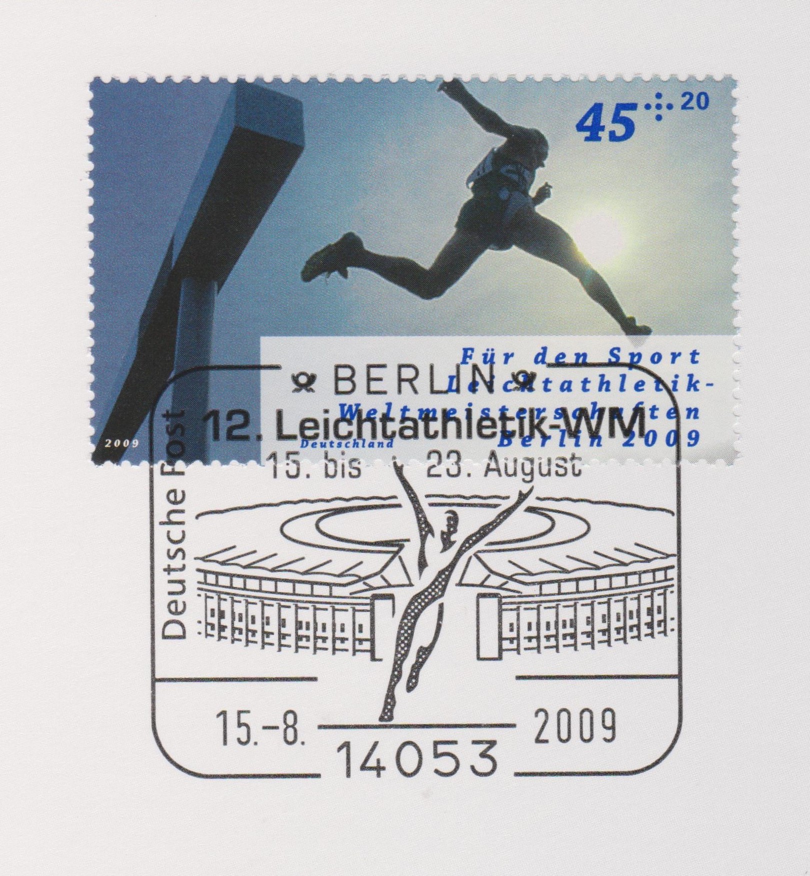 Das von Heinz hier bereits vorgestellte Postwertzeichen zu 45 + 20 Cent, MiNr. 2727, zeigt einen Hindernisläufer beim Überqueren einen Hindernisses, hier mit passendem Sonderstempel zur Eröffnung der 12. Lechtathletik-WM in Berlin am 15.08.2009 auf Blatt 38 der Deutsche Post Stempelsammlung 2009: