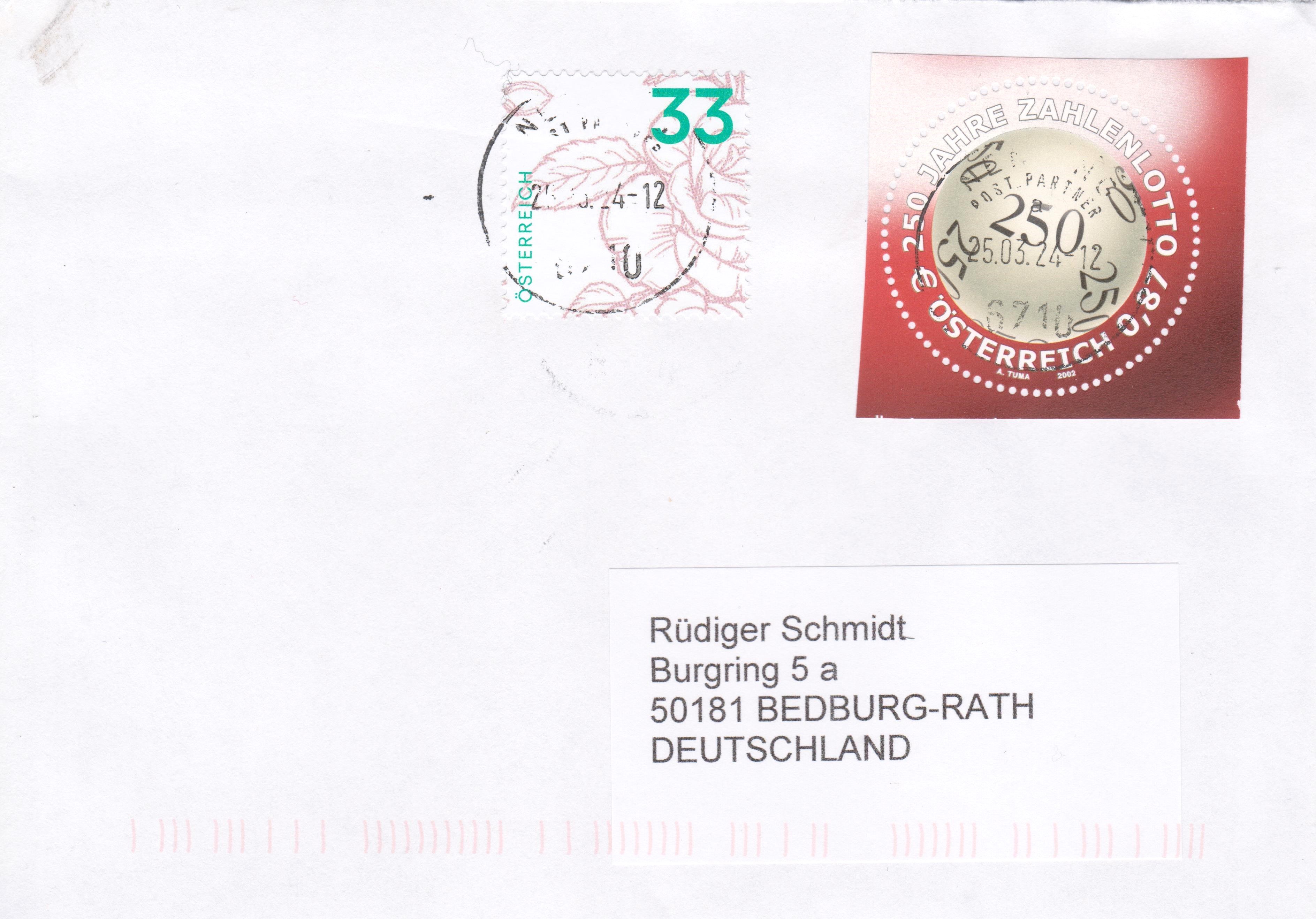 Österreich MiNr 2396 zum Thema 250 JAHRE ZAHLENLOTTO als Mischfrankatur auf echt gelaufenem Brief: