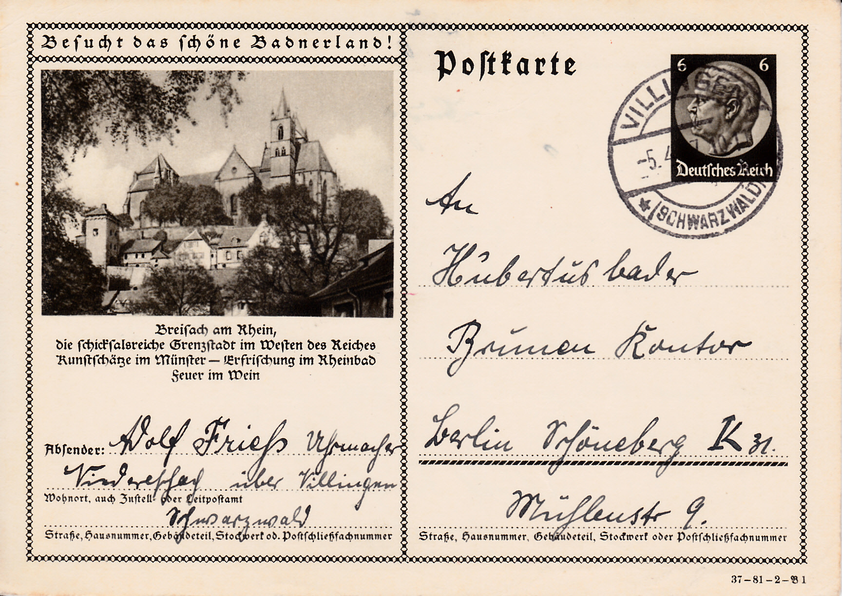 Ich beginne mit der Karte mit dem Druckvermerk 37-81-1-B1 (Ausgabejahr 1937-Serie 81-Druckplatte 1-Bild 1; bei weiteren Karten nenne ich jeweils die Serie und die Bildnummer, die Druckplattennummer nur, wenn es verschiedene Druckplattennummern bei der jeweiligen Serie gibt).