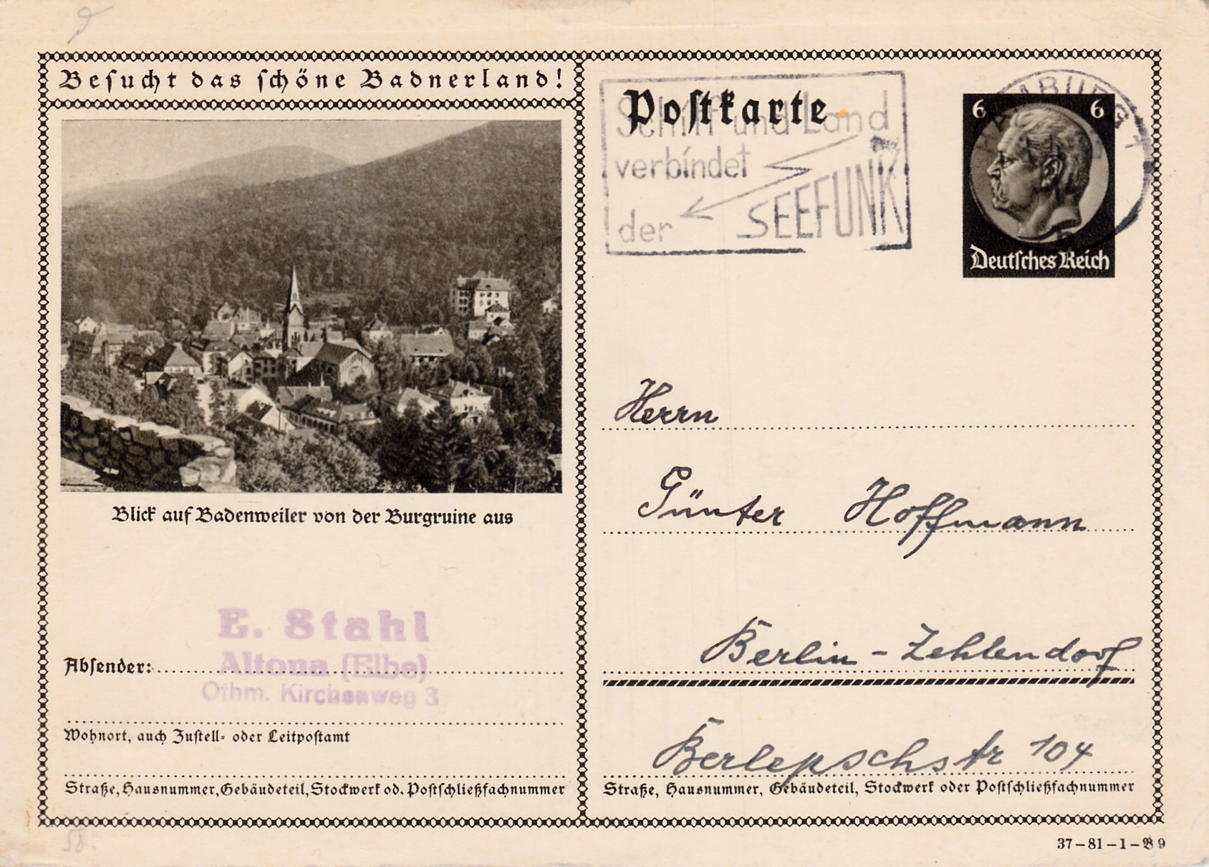 Diese Karte kann ich auch noch mit einem anderen Druckvermerk zeigen: 37-81-1-B 9 (Serie 81 Druckplatte 1 Bild 9).