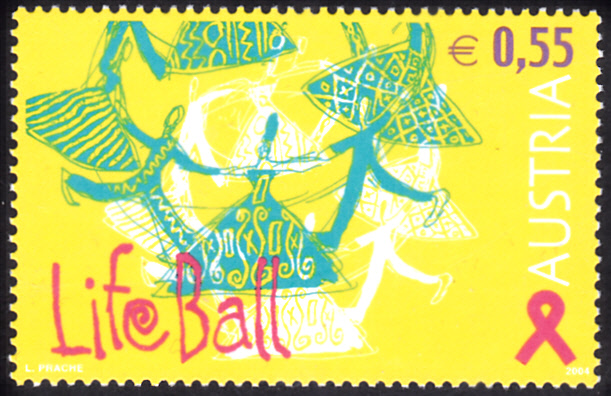 Zum Life Ball 2004 in Wien (Benefizgala zugunsten der Aids-Hilfe) erschien in Österreich diese Marke (MiNr 2471) mit der Darstellung von tanzenden Menschen.