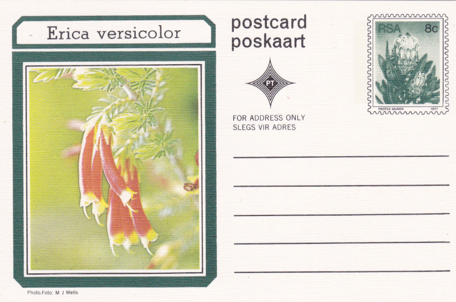 Die hier gezeigten Bildpostkarten aus Südafrika gibt es auch in der Wertstufe zu 8 Cent mit den Wertstempel mit einer "Protea aristata" (wie Marke MiNr 521, die hier schon gezeigt wurde). Ich beginne hier mit der Karte mit dem Zudruck "Blüten einer Erica pinea".