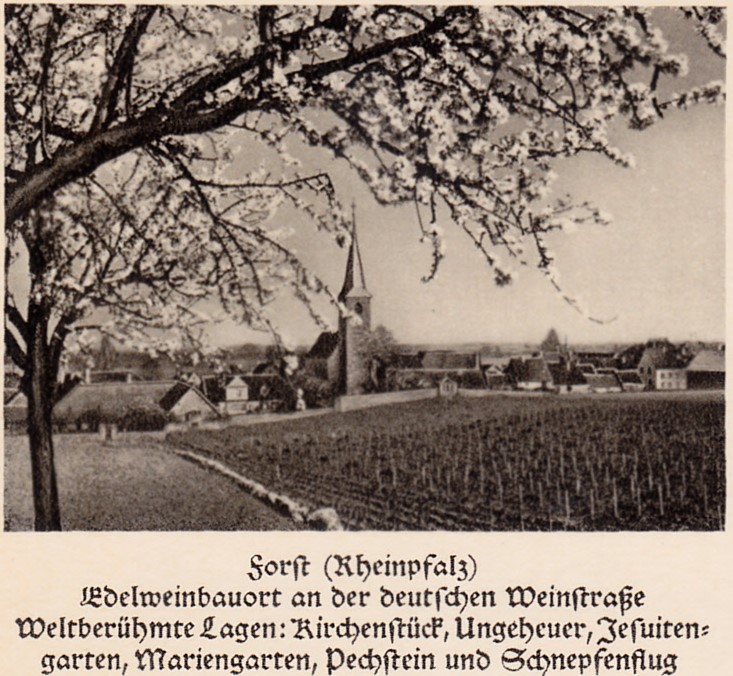 Der Weinort Forst (Rheinpfalz) bildet auf dieser Bildpostkarte (MiNr P 236; Serie 84 Bild 8) ein Foto mit einem Wingert und einem Blick auf Forst ab. Es wird außerdem für ein paar Forster Weinlagen im Text geworben.