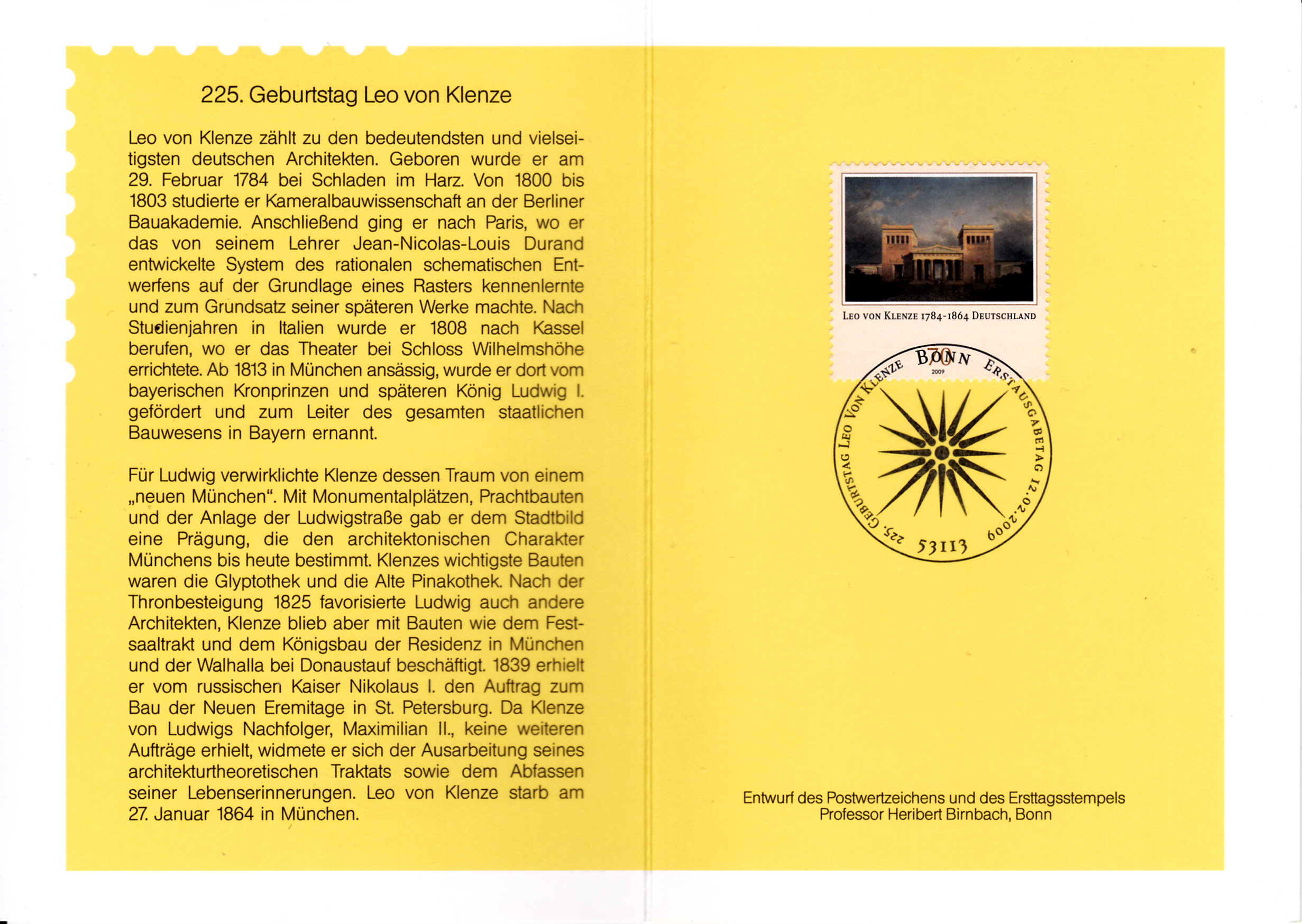 Auf einer Marke der Deutschen Post (MiNr 2719) zum 225. Geburtstag von Leo von Klenze ist das Gemälde "Ansicht der Propyläen in München" von Leo von Klenze abgebildet.