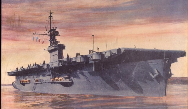 Die USS MAKASSAR STREET (CVE-91) war ein Flugzeugträger der CASABLANCA-Klasse, hier eine zeitgenössische Zeichnung: