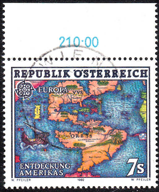 Die Europamarke 1992 aus Österreich zum Gemeinschaftsthema "500. Jahrestag der Entdeckung von Amerika" ist am 8. März 1992 erschienen. Hier diese Marke zu 7 Schilling mit der Abbildung einer Landkarte von Amerika aus dem 16. Jahrhundert. Die Auflage der Marke betrug 3 000 000 Stück.