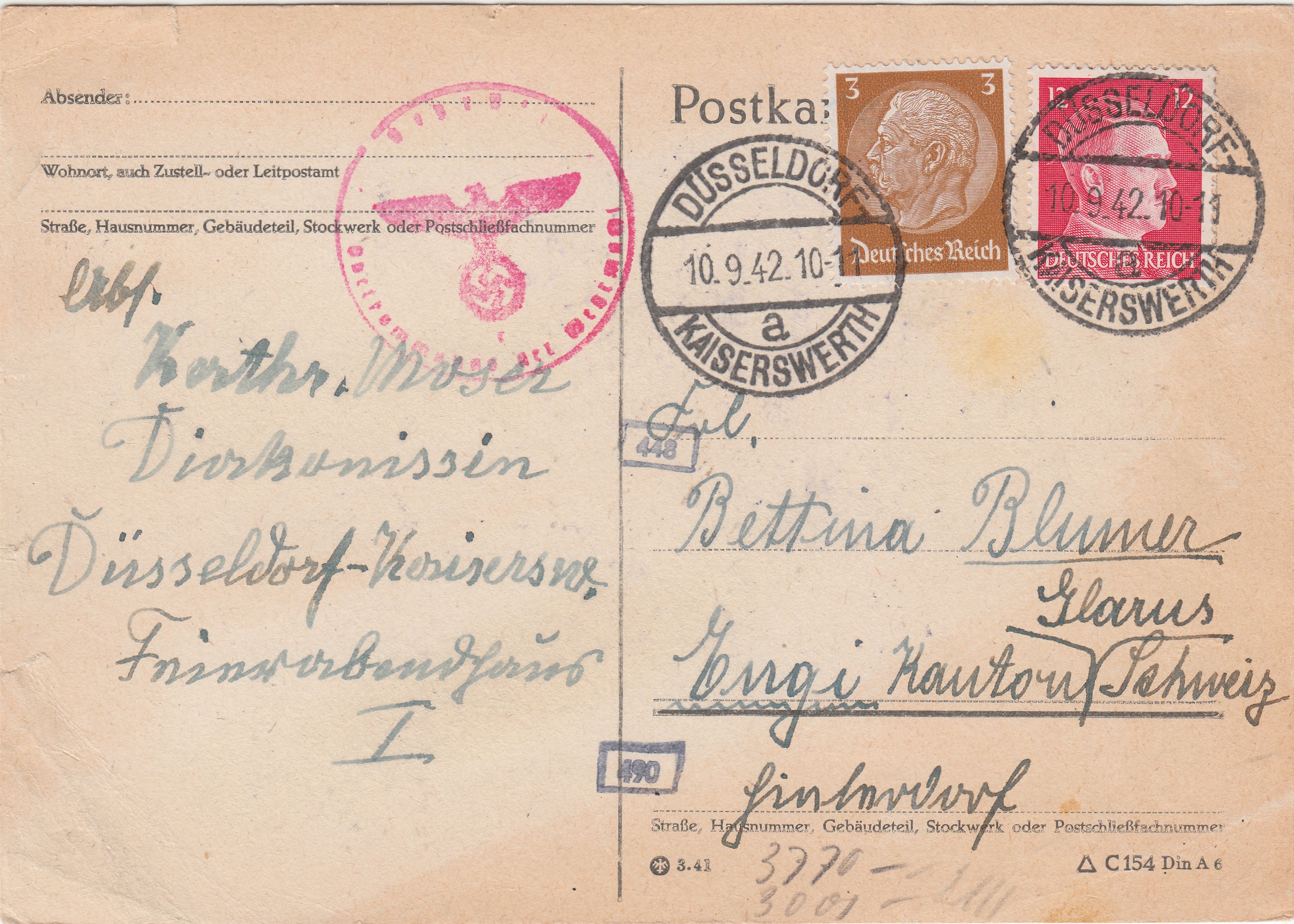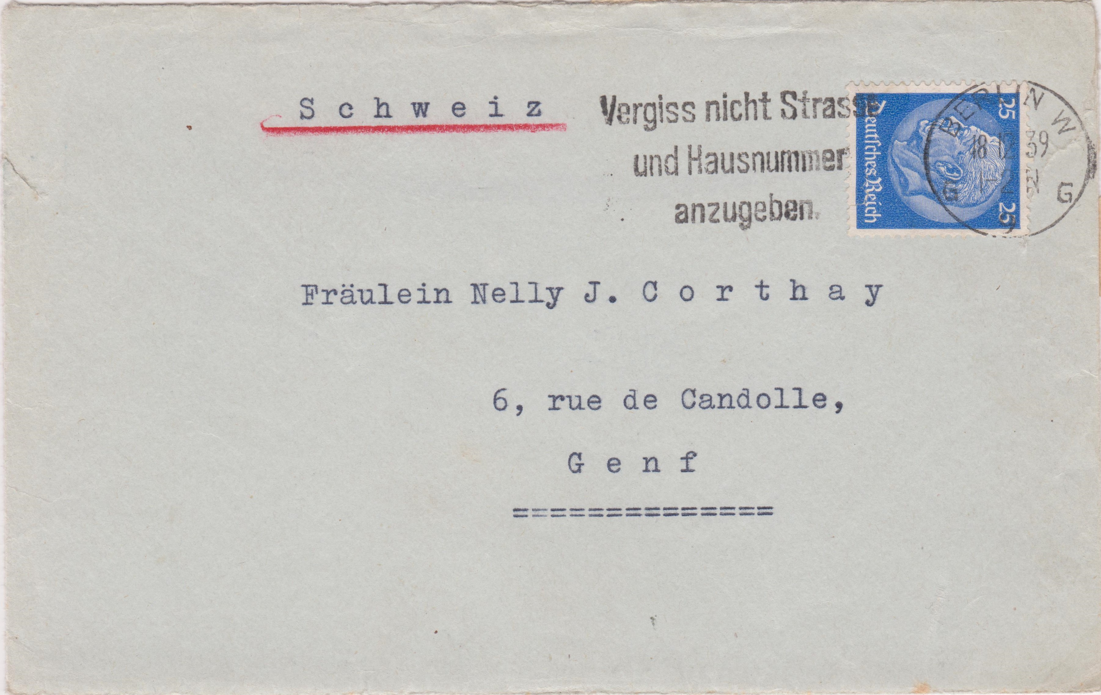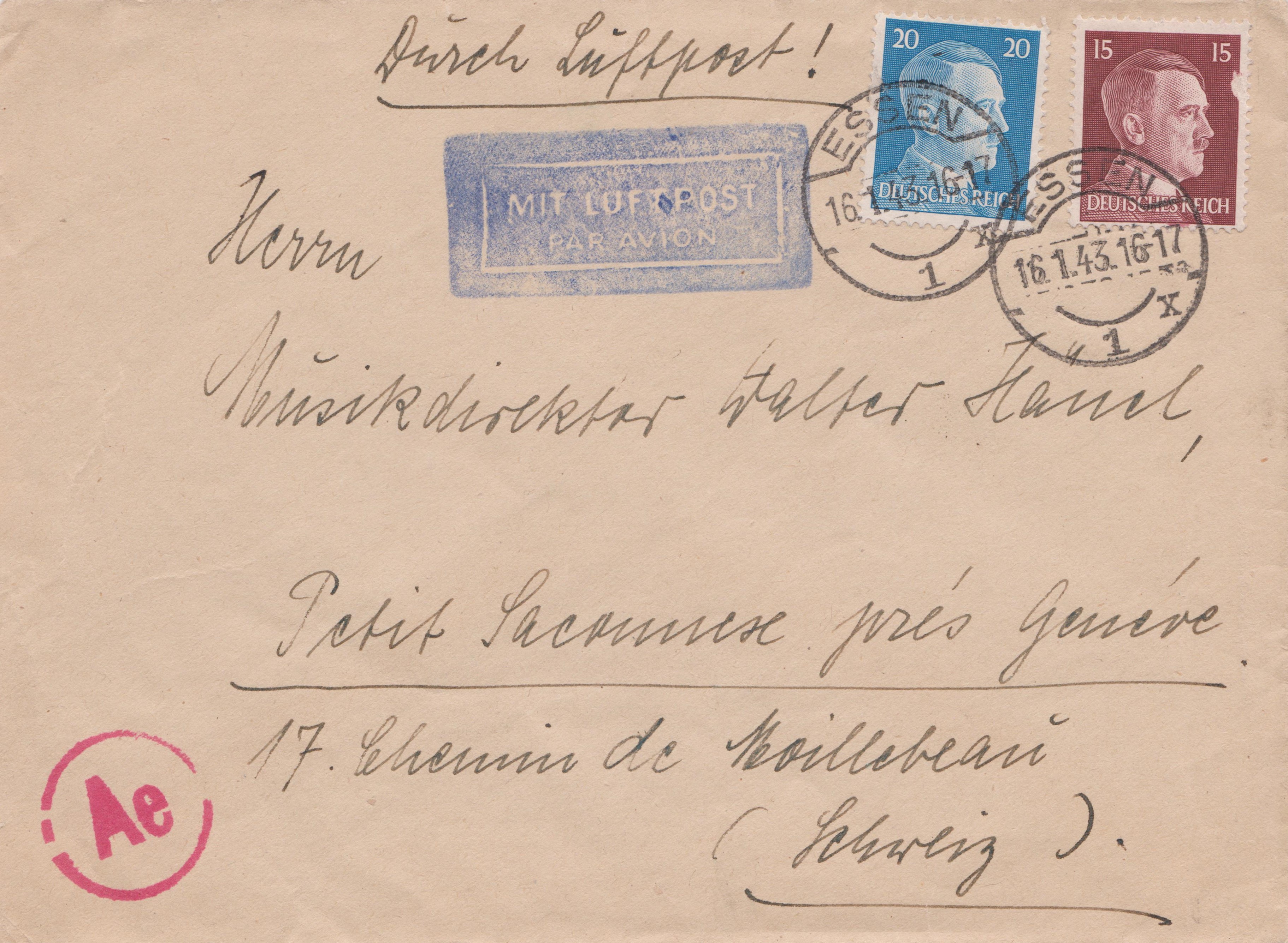 Brief in die Schweiz (Porto: 25 Pf) per Luftpost (10 Pf), eingeliefert am 16.01.1943 in Essen: